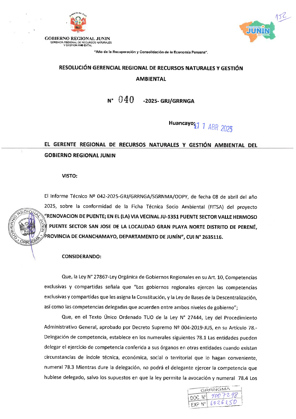 Mediante la Resolución Gerencial Regional N° 040-2025-GRJ/GRRNGA, emitida el 11 de abril de 2025, el Gobierno Regional de Junín otorgó la conformidad a la Ficha Técnica Socio Ambiental (FITSA) y la correspondiente certificación ambiental para el proyecto "Renovación de puente; en el (la) vía vecinal JU-1351 puente sector Valle Hermoso puente sector San José de la localidad Gran Playa Norte, distrito de Perené, provincia de Chanchamayo" (CUI N° 2635116). Esta aprobación, sustentada en el Informe Técnico N° 042-2025, valida que la propuesta técnica cumple con la normativa ambiental vigente, permitiendo avanzar con la ejecución de la infraestructura. Con este acto, la entidad ejecutora queda obligada a implementar las medidas de manejo ambiental y social establecidas, así como a informar el inicio de las obras en un plazo de 30 días hábiles para asegurar la supervisión y el cumplimiento de los compromisos ambientales en beneficio de la selva central.