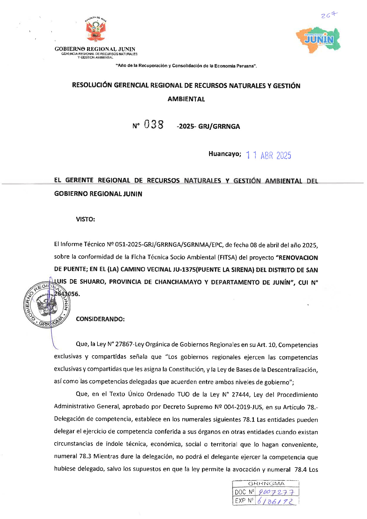 Mediante la Resolución Gerencial Regional N° 038-2025-GRJ/GRRNGA, con fecha 11 de abril de 2025, el Gobierno Regional de Junín otorgó la conformidad a la Ficha Técnica Socio Ambiental (FITSA) y la correspondiente certificación ambiental para el proyecto "Renovación de puente; en el (la) camino vecinal JU-1375 (Puente La Sirena) del distrito de San Luis de Shuaro, provincia de Chanchamayo" (CUI N° 2643056). Esta aprobación, sustentada en el Informe Técnico N° 051-2025, confirma que la propuesta cumple con los estándares ambientales vigentes, permitiendo así la ejecución de la obra. Con este acto administrativo, el titular del proyecto queda obligado a implementar todas las medidas de prevención y mitigación establecidas en la FITSA, además de comunicar el inicio de las obras en un plazo de 30 días hábiles para asegurar la correcta supervisión y cumplimiento de los compromisos socioambientales.