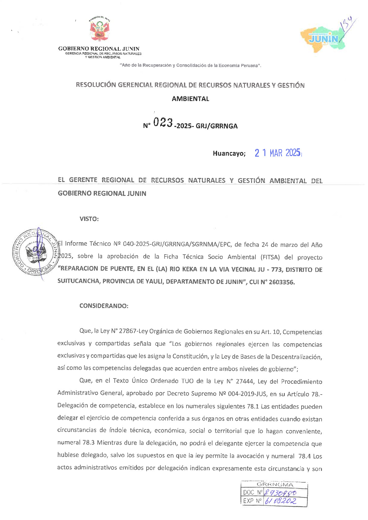 El Gobierno Regional de Junín, a través de la Gerencia Regional de Recursos Naturales y Gestión Ambiental, emitió la Resolución Gerencial Regional N° 023-2025-GRJ/GRRNGA que otorga la conformidad a la Ficha Técnica Socio Ambiental (FITSA) para el proyecto de "Reparación de puente en el río Keka en la vía vecinal JU-773", ubicado en el distrito de Suitucancha, provincia de Yauli. Esta certificación ambiental asegura que la intervención cumple con la normativa técnica para el sector transportes al no afectar áreas naturales protegidas ni ecosistemas frágiles, estableciendo que el titular debe implementar estrictamente el Plan de Manejo Ambiental para el control de residuos, ruidos y emisiones. Con esta aprobación, el proyecto alcanza la viabilidad ambiental necesaria para proseguir con sus etapas administrativas y la obtención de permisos adicionales antes de iniciar la ejecución física de la obra.