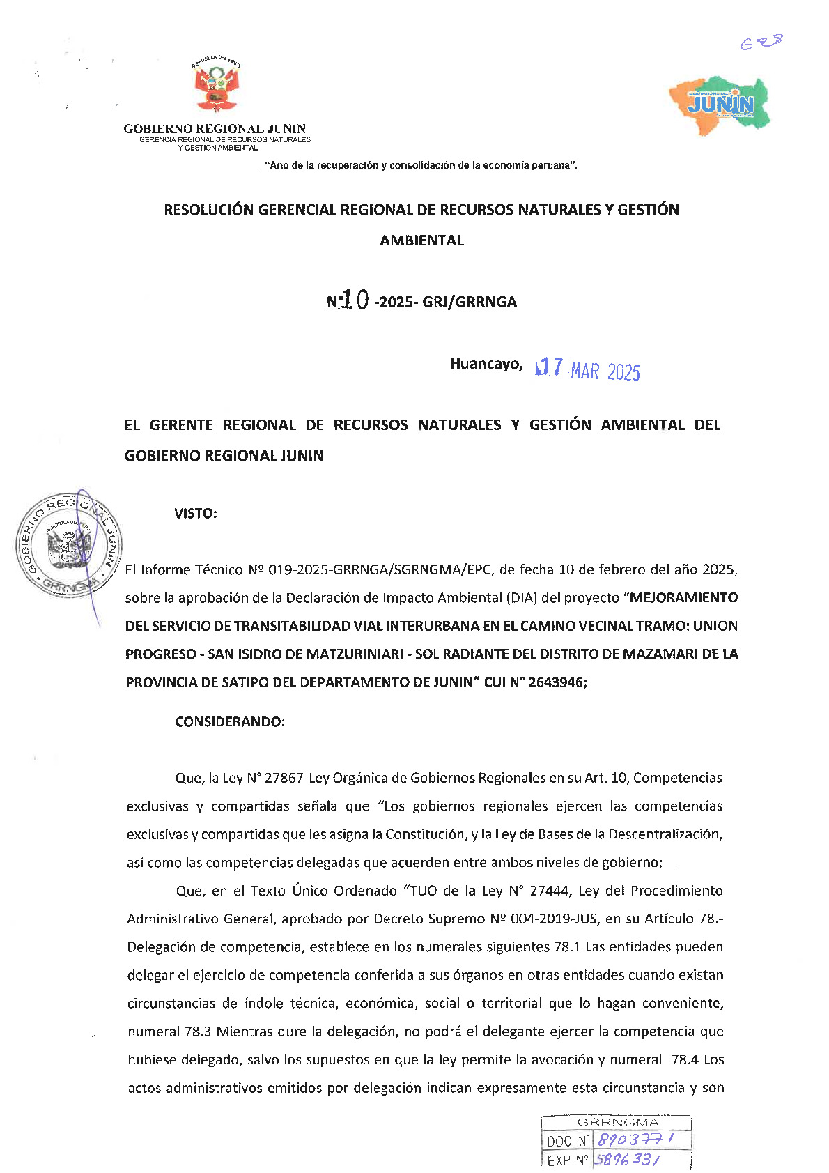 El Gobierno Regional de Junín, mediante la Resolución Gerencial Regional N° 10-2025-GRJ/GRRNGA emitida el 17 de marzo de 2025 , aprobó la Declaración de Impacto Ambiental (DIA) para el proyecto de "Mejoramiento del servicio de transitabilidad vial interurbana" en el camino vecinal que une las localidades de Unión Progreso, San Isidro de Matzuriniari y Sol Radiante en el distrito de Mazamari, provincia de Satipo. Esta certificación ambiental se otorgó tras verificar que el proyecto de 12.620 km de longitud no afecta áreas naturales protegidas ni cuerpos de agua cercanos , estableciendo que la Municipalidad Distrital de Mazamari debe cumplir con el Plan de Manejo Ambiental, el cual incluye programas de control de erosión, emisiones, ruidos y manejo de residuos para garantizar la sostenibilidad de la obra vial.