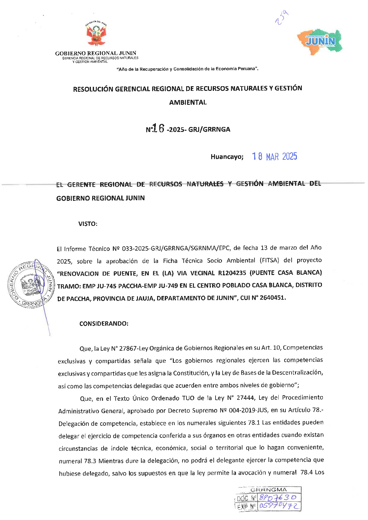l Gobierno Regional de Junín, mediante la Resolución Gerencial Regional N° 16-2025-GRJ/GRRNGA, otorgó la conformidad a la Ficha Técnica Socio Ambiental (FITSA) para el proyecto de "Renovación de puente en la vía vecinal R1204235 (Puente Casa Blanca)", ubicado en el distrito de Paccha, provincia de Jauja. Esta certificación ambiental confirma que la infraestructura propuesta cumple con la normativa vigente y no genera impactos negativos significativos en áreas protegidas, permitiendo así avanzar con la mejora de la transitabilidad interurbana. Con esta aprobación, el titular del proyecto queda comprometido a ejecutar las medidas de prevención y mitigación ambiental establecidas, además de gestionar las licencias sectoriales correspondientes antes de dar inicio a la ejecución física de la obra.