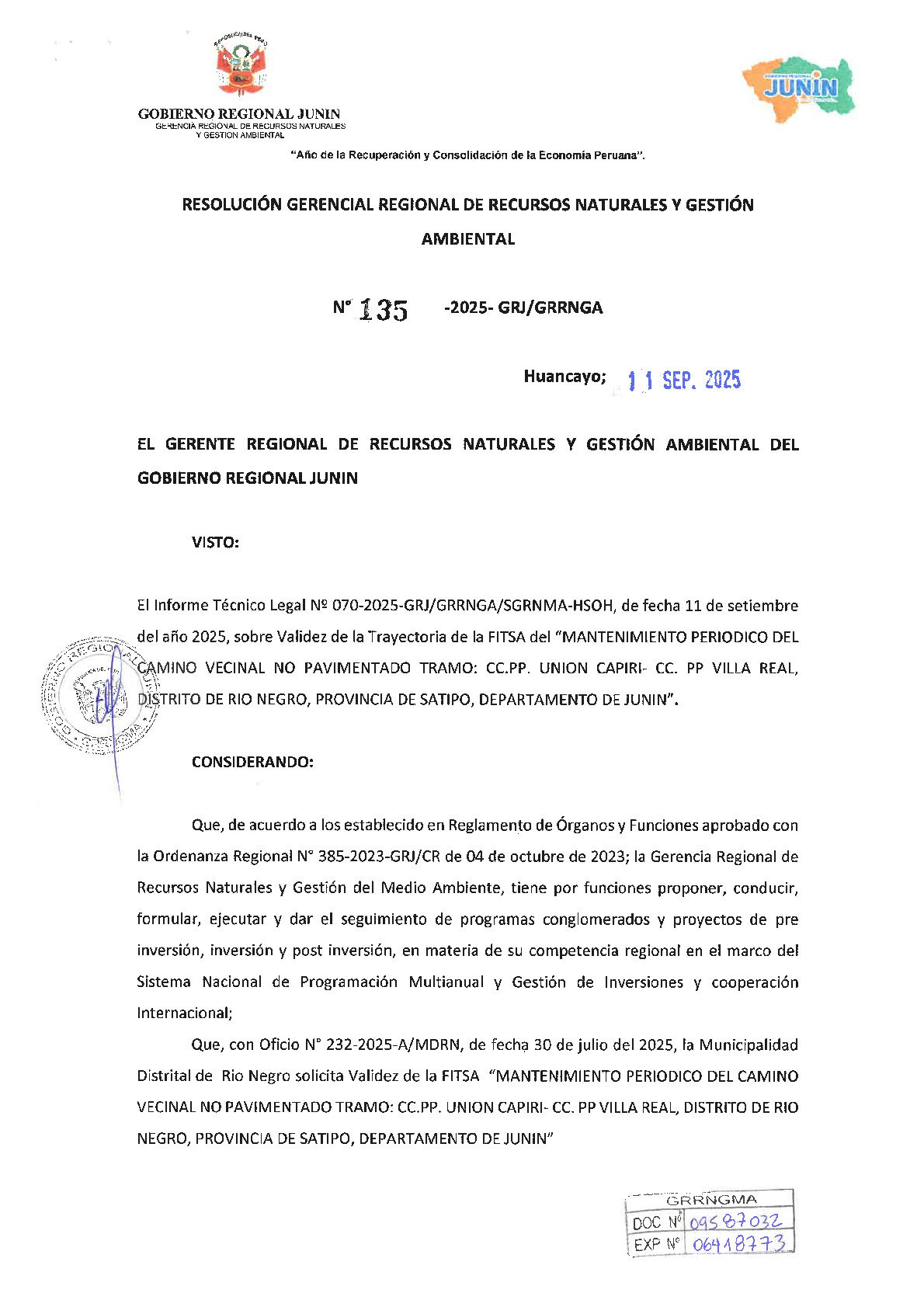 El Gobierno Regional de Junín, a través de la Gerencia Regional de Recursos Naturales y Gestión Ambiental, emitió la Resolución Gerencial Regional N° 135-2025-GRJ/GRRNGA, la cual valida la trayectoria técnica de la Ficha Técnica Socio Ambiental (FITSA) para el mantenimiento periódico de una red vial de 34.400 kilómetros en el distrito de Río Negro, provincia de Satipo. Esta intervención abarca tramos estratégicos que conectan a los centros poblados de Unión Capiri, Villa Real, Villa Progreso y Alto Pitocuna, entre otros. Con esta resolución, se asegura que los trabajos de mejora de transitabilidad cumplan con los estándares técnicos y ambientales vigentes, reafirmando el compromiso de la gestión regional con la integración de las zonas rurales y el dinamismo económico de la Selva Central.