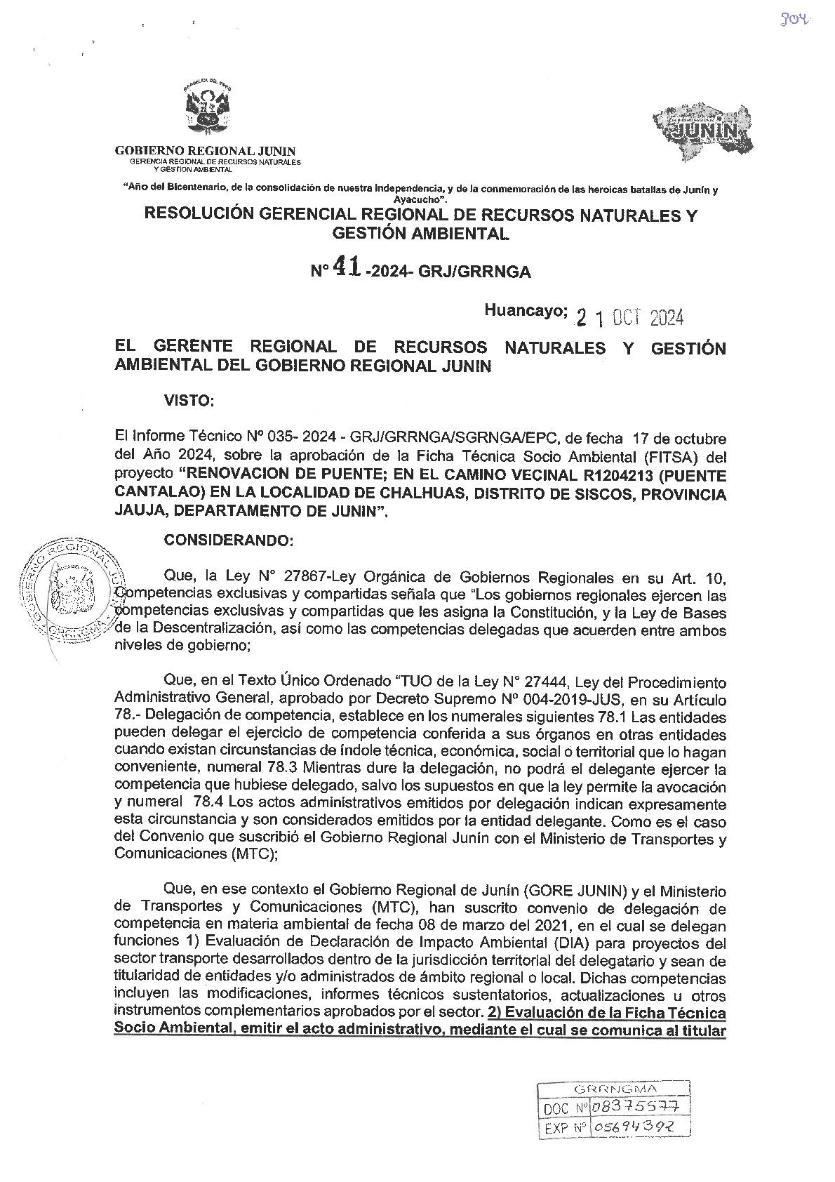 El Gobierno Regional de Junín, mediante la Resolución Gerencial Regional N° 41-2024-GRJ/GRRNGA emitida el 21 de octubre de 2024, aprobó la Ficha Técnica Socio Ambiental (FITSA) para el proyecto de "Renovación del Puente Cantalao" en la localidad de Chalhuas, distrito de Sincos, provincia de Jauja. Esta certificación ambiental, sustentada en el Informe Técnico Nº 035-2024-GRJ/GRRNGA, declara la viabilidad del proyecto al asegurar que cumple con los estándares para prevenir impactos negativos en el entorno, permitiendo así que la entidad ejecutora avance con la modernización de esta infraestructura clave para mejorar la transitabilidad vehicular y la seguridad de los pobladores de la zona.
