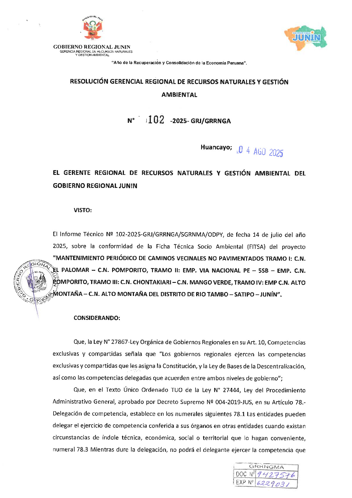 El Gobierno Regional de Junín, a través de la Gerencia Regional de Recursos Naturales y Gestión Ambiental, emitió la Resolución Gerencial Regional N° 102-2025-GRJ/GRRNGA el pasado 4 de agosto, otorgando la conformidad a la Ficha Técnica Socio Ambiental (FITSA) para el proyecto de mantenimiento periódico de caminos vecinales no pavimentados en el distrito de Río Tambo, Satipo. Esta certificación ambiental abarca cuatro tramos estratégicos que conectan a comunidades como El Palomar, Pomporito, Chontakiari, Mango Verde y Alto Montaña, permitiendo que la Municipalidad Distrital de Río Tambo ejecute las mejoras viales bajo estrictos compromisos de mitigación ambiental y social para proteger el entorno natural de la selva central.