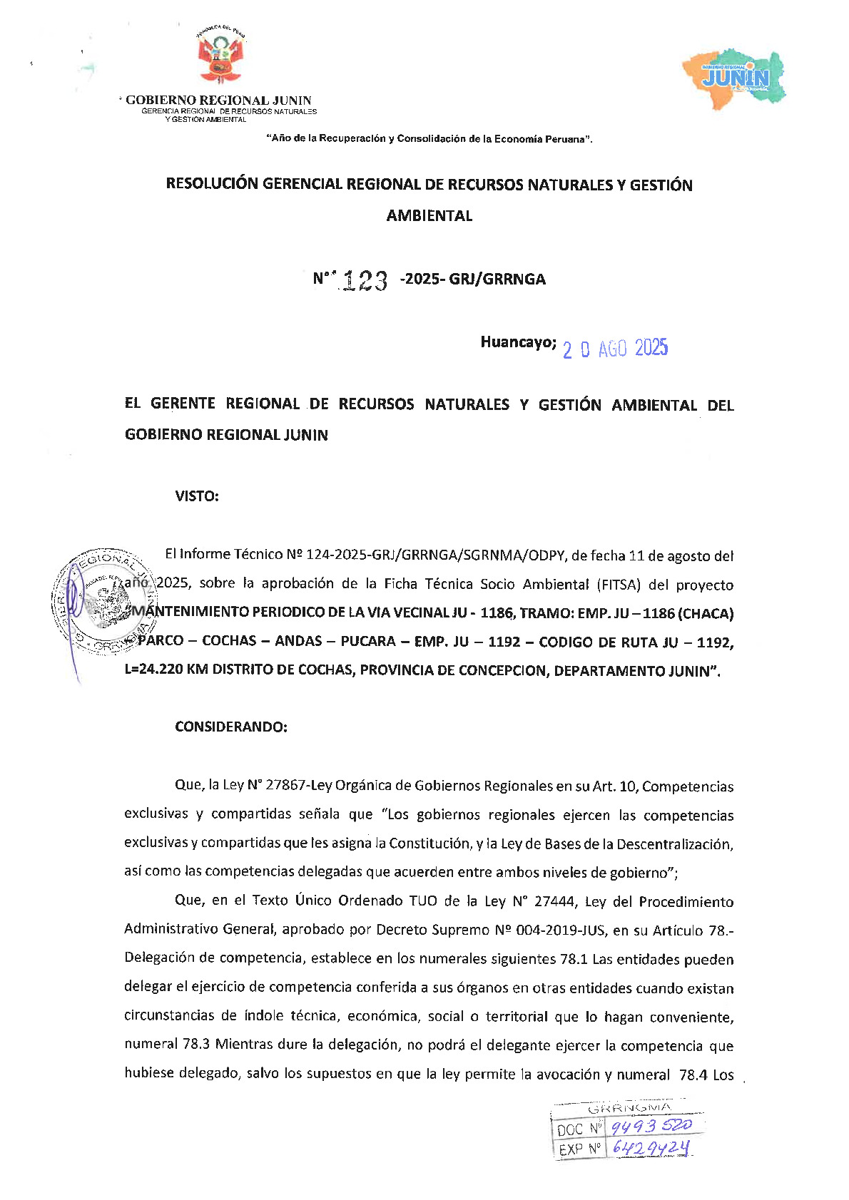 El Gobierno Regional de Junín, a través de la Gerencia Regional de Recursos Naturales y Gestión Ambiental, emitió la Resolución Gerencial Regional N° 123-2025-GRJ/GRRNGA, otorgando la conformidad a la Ficha Técnica Socio Ambiental (FITSA) para el proyecto de mantenimiento periódico de la vía vecinal JU-1186. La obra, que cuenta con una extensión de 24.220 kilómetros, recorre los sectores de Chaca, Preparco, Cochas, Andas y Pucará, en el distrito de Cochas, provincia de Concepción. Esta certificación ambiental, respaldada por el Informe Técnico N° 124-2025, permite la ejecución de los trabajos bajo estrictos compromisos de manejo de residuos, control de emisiones y protección del entorno natural, reafirmando el compromiso del GRJ con el desarrollo de una infraestructura vial moderna y respetuosa con el medio ambiente.
