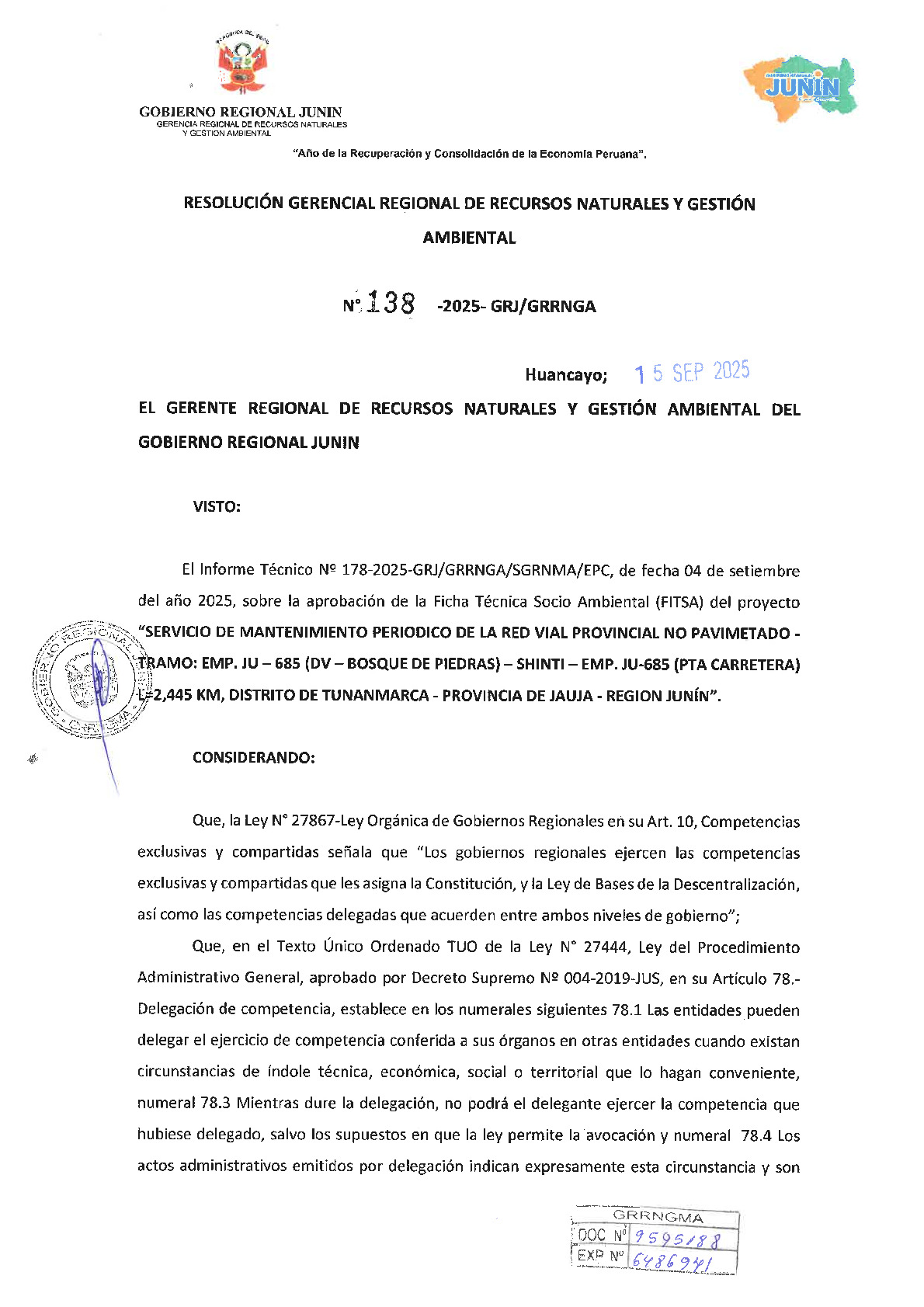 El Gobierno Regional de Junín, a través de la Gerencia Regional de Recursos Naturales y Gestión Ambiental, emitió la Resolución Gerencial Regional N° 138-2025-GRJ/GRRNGA, otorgando la conformidad a la Ficha Técnica Socio Ambiental (FITSA) para el proyecto de mantenimiento periódico de la red vial provincial no pavimentada en el tramo Emp. JU-685 (Desvío Bosque de Piedras) – Shinti. La obra, que cuenta con una extensión de 2.445 kilómetros en el distrito de Tunanmarca, provincia de Jauja, recibió la viabilidad ambiental tras el Informe Técnico N° 178-2025. Esta resolución garantiza que los trabajos se ejecuten bajo estrictas medidas de control ambiental y manejo de residuos, facilitando una transitabilidad segura que potenciará el desarrollo local y el acceso a zonas de interés turístico en la provincia.