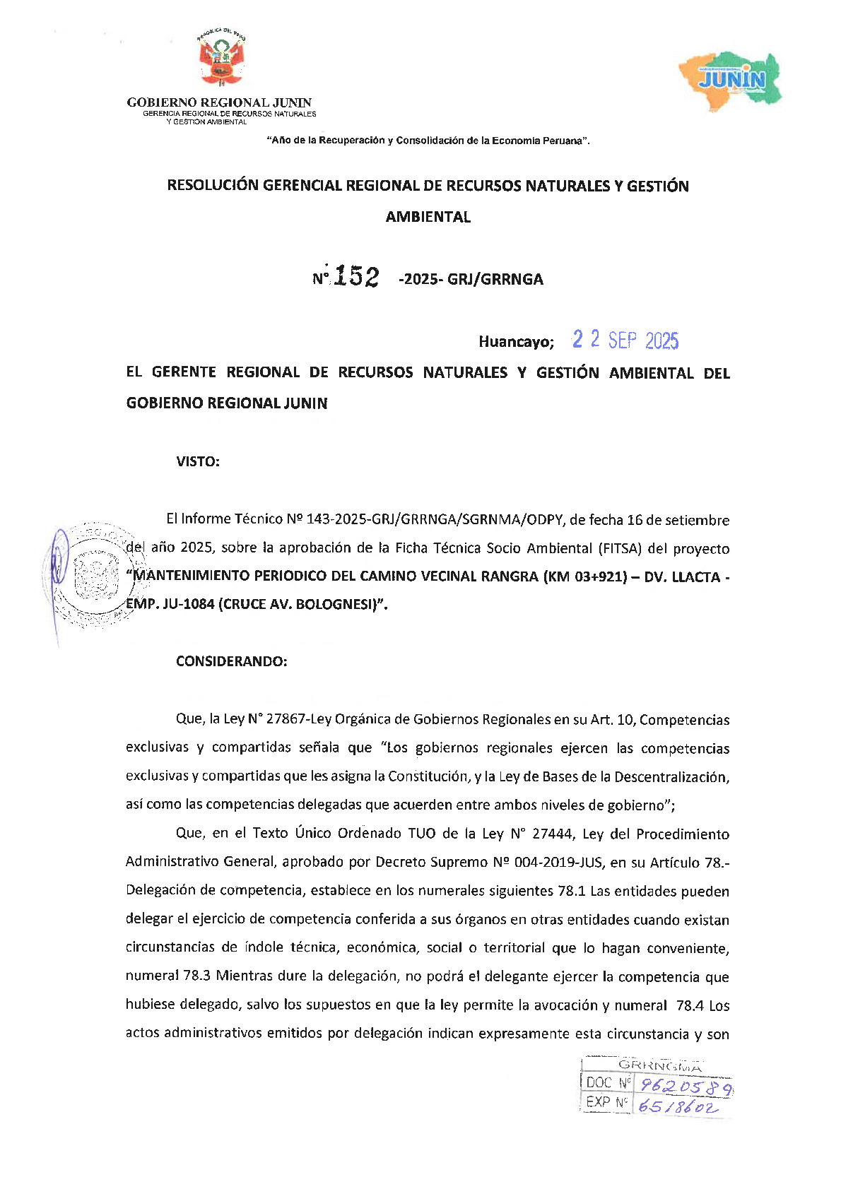 El Gobierno Regional de Junín, a través de la Gerencia Regional de Recursos Naturales y Gestión Ambiental, emitió la Resolución Gerencial Regional N° 152-2025-GRJ/GRRNGA, otorgando la conformidad a la Ficha Técnica Socio Ambiental (FITSA) para el proyecto de mantenimiento periódico del camino vecinal en el tramo Rangra (Km 03+921) – Dv. Llacta – Empalme JU-1084 (Cruce Av. Bolognesi). La obra, ubicada en el distrito de Quilcas, provincia de Huancayo, recibió la viabilidad ambiental tras el Informe Técnico N° 143-2025. Esta certificación ambiental es un paso fundamental para garantizar que los trabajos de mejora en la transitabilidad se ejecuten bajo estrictos compromisos de protección del entorno natural y manejo de residuos, reafirmando el compromiso de la gestión regional con el desarrollo de infraestructura vial segura y sostenible para el valle del Mantaro.