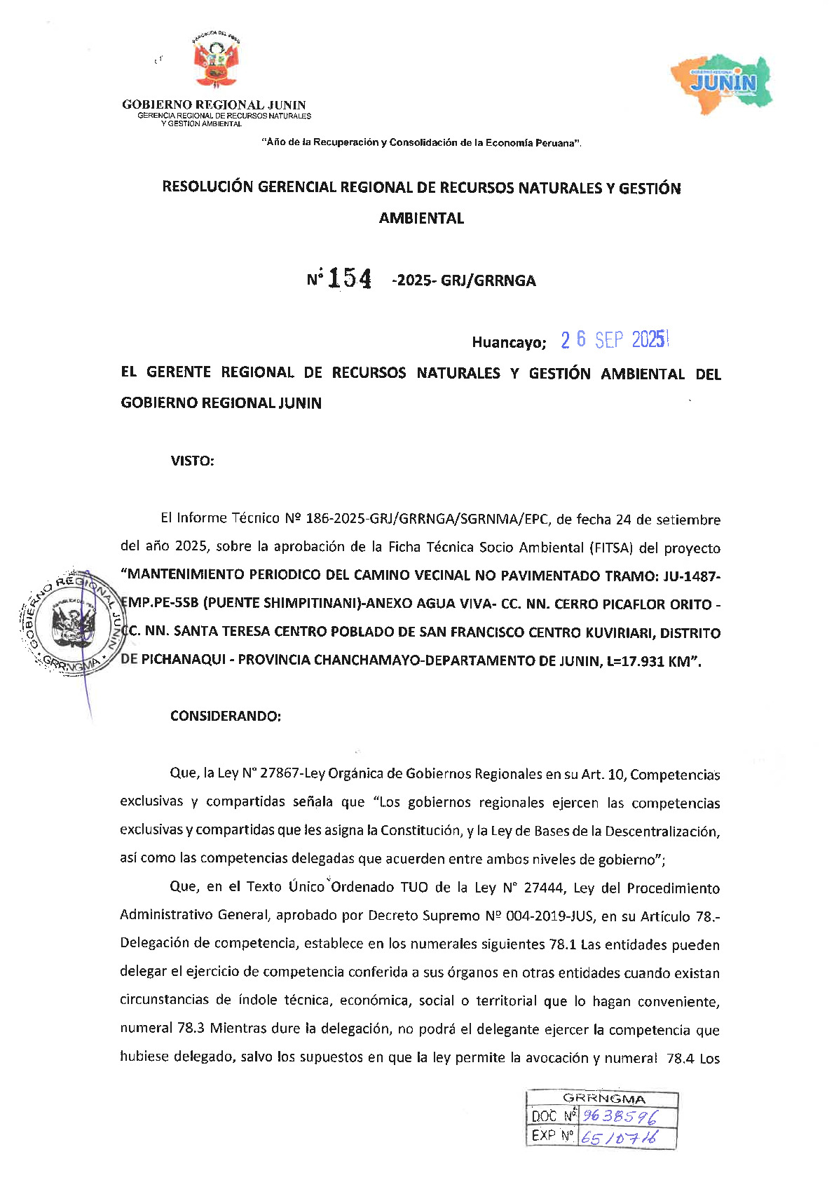 El Gobierno Regional de Junín, a través de la Gerencia Regional de Recursos Naturales y Gestión Ambiental, emitió la Resolución Gerencial Regional N° 154-2025-GRJ/GRRNGA, otorgando la conformidad a la Ficha Técnica Socio Ambiental (FITSA) para el proyecto de mantenimiento periódico del camino vecinal en el tramo Emp. PE-5SB (Puente Shimpitinani) – Anexo Agua Viva – CC.NN. Cerro Picaflor – CC.NN. Santa Teresa – Centro Poblado San Francisco – Centro Kuviriani. La obra cuenta con una extensión de 17.931 kilómetros en el distrito de Pichanaqui, provincia de Chanchamayo. Esta certificación ambiental, respaldada por el Informe Técnico N° 186-2025, garantiza que los trabajos se realicen bajo estrictos compromisos de protección del ecosistema y manejo de residuos, reafirmando el compromiso del Gobierno Regional de Junín con la integración de las comunidades nativas y el desarrollo económico sostenible de la Selva Central.