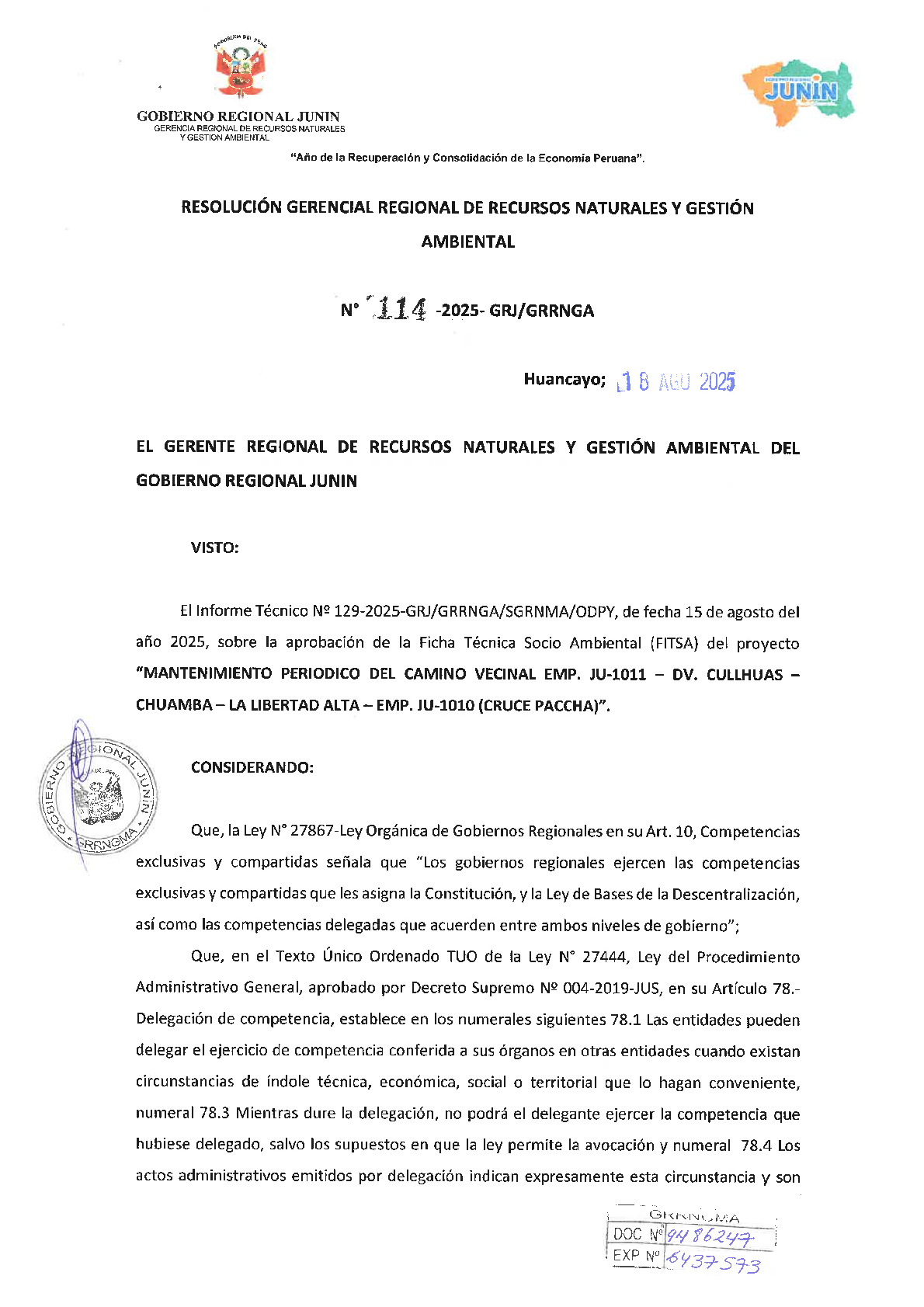 El Gobierno Regional de Junín, a través de la Gerencia Regional de Recursos Naturales y Gestión Ambiental, emitió la Resolución Gerencial Regional N° 114-2025-GRJ/GRRNGA, otorgando la conformidad a la Ficha Técnica Socio Ambiental (FITSA) para el proyecto de mantenimiento periódico del camino vecinal que conecta el desvío Cullhuas, Chuamba y La Libertad Alta hasta el Cruce Paccha, en la provincia de Huancayo. Esta certificación ambiental, sustentada en el Informe Técnico N° 129-2025, permite la ejecución de las obras bajo estrictos compromisos de manejo de residuos, control de emisiones y protección del entorno natural, garantizando que el desarrollo de la infraestructura vial se realice en armonía con el medio ambiente y en beneficio directo de la población local.