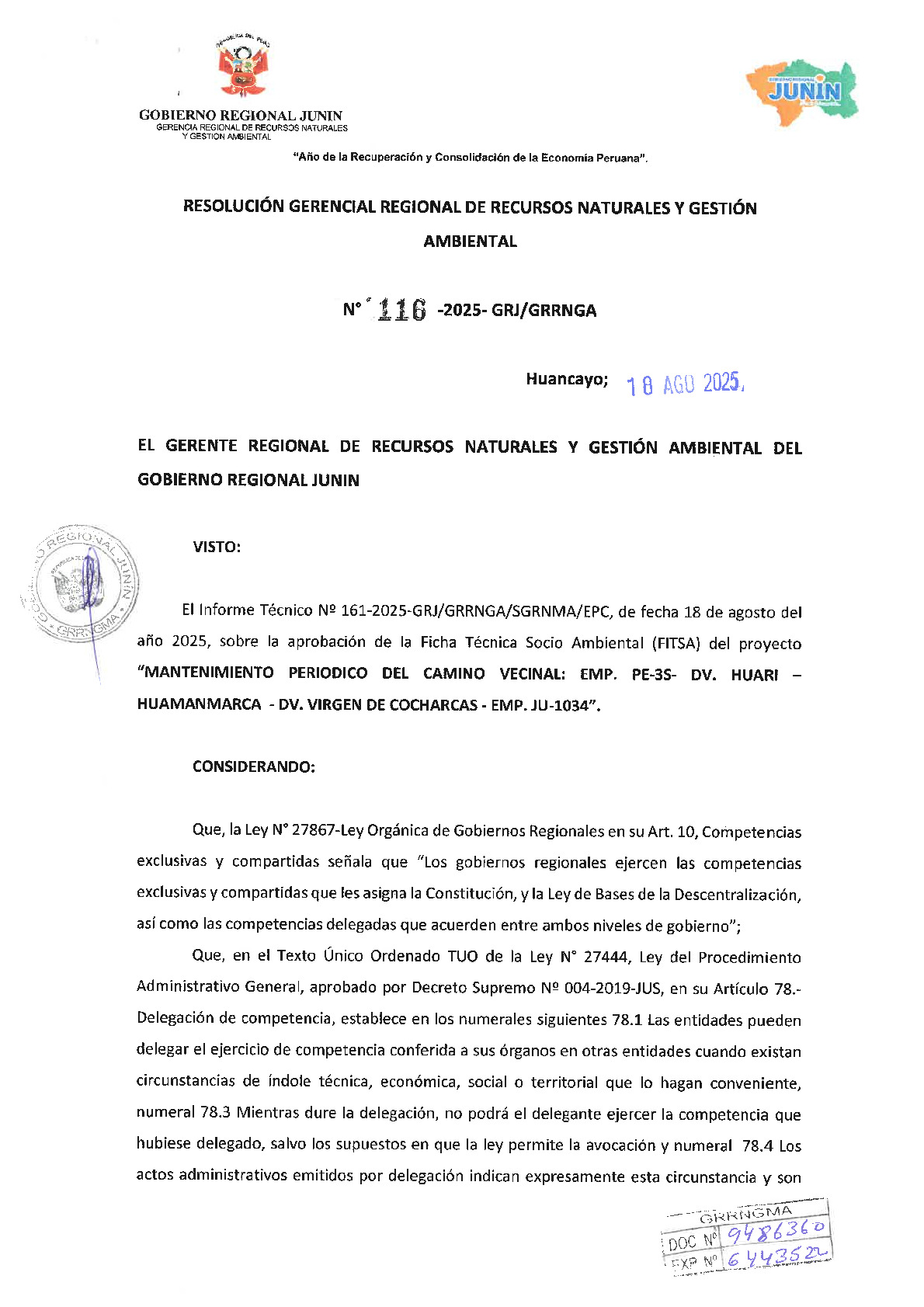 El Gobierno Regional de Junín, a través de la Gerencia Regional de Recursos Naturales y Gestión Ambiental, emitió la Resolución Gerencial Regional N° 116-2025-GRJ/GRRNGA, otorgando la conformidad a la Ficha Técnica Socio Ambiental (FITSA) para el proyecto de mantenimiento periódico del camino vecinal que conecta el Desvío Huari, Huamanmarca y el Desvío Virgen de Cocharcas hasta el empalme con la vía JU-1034, en la provincia de Huancayo. Esta certificación ambiental, sustentada en el Informe Técnico N° 161-2025, valida la viabilidad del proyecto y obliga a la entidad ejecutora a implementar medidas estrictas de manejo de residuos, control de ruidos y protección del entorno natural. Con esta medida, el Gobierno Regional de Junín reafirma su compromiso con el desarrollo de infraestructura vial sostenible que facilite el transporte seguro y mejore la calidad de vida de los pobladores de la zona.