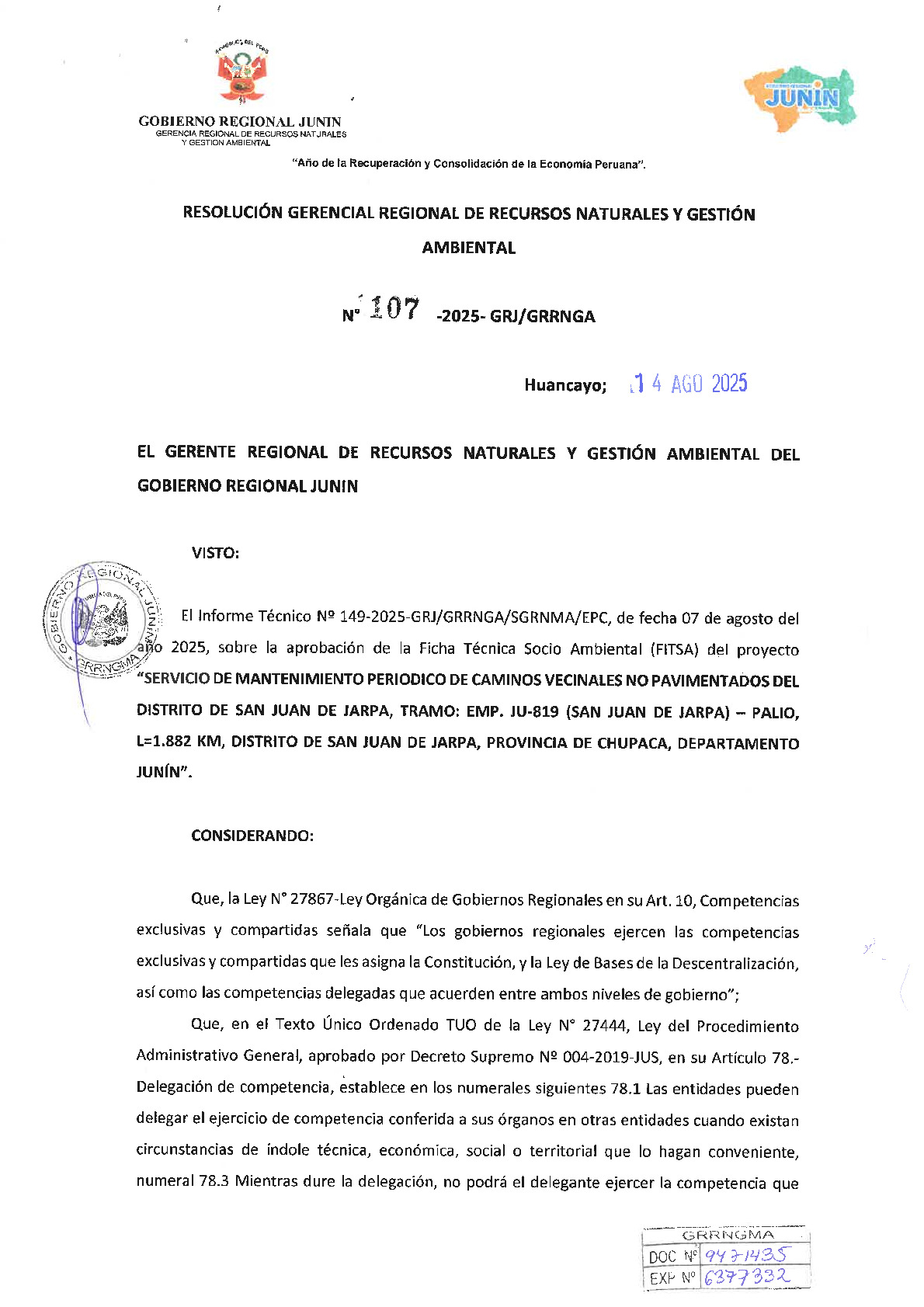 El Gobierno Regional de Junín, a través de la Gerencia Regional de Recursos Naturales y Gestión Ambiental, emitió la Resolución Gerencial Regional N° 107-2025-GRJ/GRRNGA, mediante la cual otorga la conformidad a la Ficha Técnica Socio Ambiental (FITSA) para el proyecto de mantenimiento periódico del camino vecinal en el tramo San Juan de Jarpa – Palio, con una extensión de 1.882 kilómetros en la provincia de Chupaca. Esta certificación ambiental, sustentada en el Informe Técnico N° 149-2025, permite la ejecución de los trabajos de mantenimiento bajo estrictos compromisos de manejo de residuos, control de polvo y protección del entorno natural, garantizando que la mejora de la transitabilidad para las familias rurales se realice en armonía con el medio ambiente y el cumplimiento de la normativa vigente.