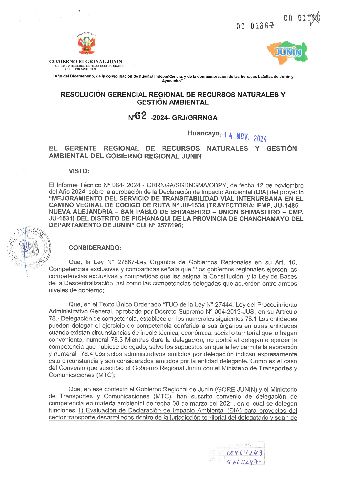 El Gobierno Regional de Junín, a través de la Gerencia Regional de Recursos Naturales y Gestión Ambiental, emitió la Resolución Gerencial Regional N° 62-2024-GRJ/GRRNGA, mediante la cual aprueba la Declaración de Impacto Ambiental (DIA) para el proyecto de "Mejoramiento del servicio de transitabilidad vial interurbana en el camino vecinal JU-1534". El proyecto, identificado con el CUI N° 2576196, abarca la trayectoria que une a los sectores de Nueva Alejandría, San Pablo de Shimashiro y Unión Shimashiro, en el distrito de Pichanaqui, provincia de Chanchamayo. Esta certificación ambiental, sustentada en el Informe Técnico N° 084-2024, garantiza que los trabajos se ejecuten bajo estrictos compromisos de protección del ecosistema amazónico, reafirmando el compromiso de la gestión regional con el desarrollo económico y la integración de las comunidades de la Selva Central de manera sostenible.
