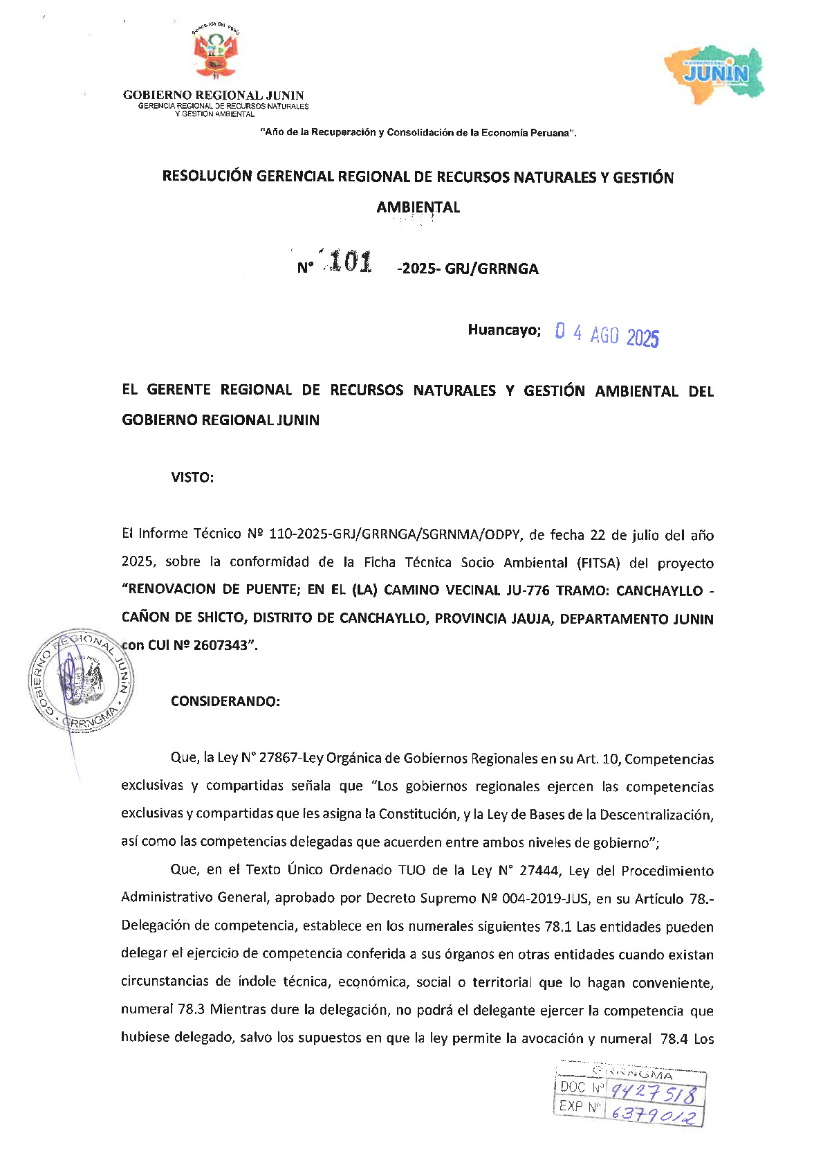 El Gobierno Regional de Junín, mediante la Resolución Gerencial Regional N° 101-2025-GRJ/GRRNGA emitida el 4 de agosto de 2025, otorgó la conformidad a la Ficha Técnica Socio Ambiental (FITSA) para el proyecto de renovación de un puente en el camino vecinal JU-776, tramo Canchayllo – Cañón de Shucto, en la provincia de Jauja. Esta decisión, que actúa como certificación ambiental, se sustenta en la opinión técnica favorable del SERNANP debido a la ubicación del proyecto en la zona de influencia de la Reserva Paisajística Nor Yauyos Cochas. Con esta resolución, la Municipalidad Provincial de Jauja queda obligada a implementar medidas estrictas de manejo ambiental, como el control de residuos, ruidos y emisiones, así como la protección del patrimonio natural y cultural durante la ejecución de la obra.