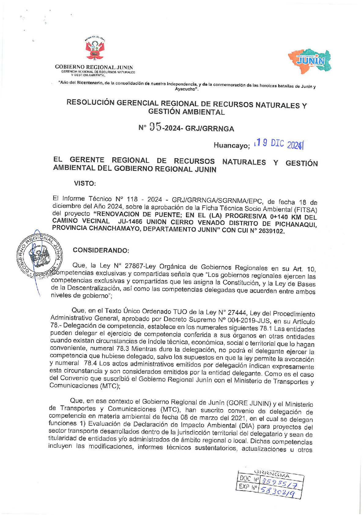 El Gobierno Regional de Junín, a través de la Gerencia Regional de Recursos Naturales y Gestión Ambiental, emitió la Resolución Gerencial Regional N° 95-2024-GRJ/GRRNGA, mediante la cual otorga la conformidad a la Ficha Técnica Socio Ambiental (FITSA) para el proyecto "Renovación de puente; en el (la) progresiva 0+140 km del camino vecinal JU-1466 Unión Cerro Venado". La obra, ubicada en el distrito de Pichanaqui, provincia de Chanchamayo, cuenta con el Código Único de Inversión (CUI) N° 2639102. Esta certificación ambiental, sustentada en el Informe Técnico N° 118-2024, asegura que los trabajos de infraestructura se realicen bajo estrictos compromisos de protección del ecosistema amazónico y manejo de residuos, reafirmando el compromiso de la gestión regional con la integración vial y el desarrollo sostenible de la provincia de Chanchamayo.