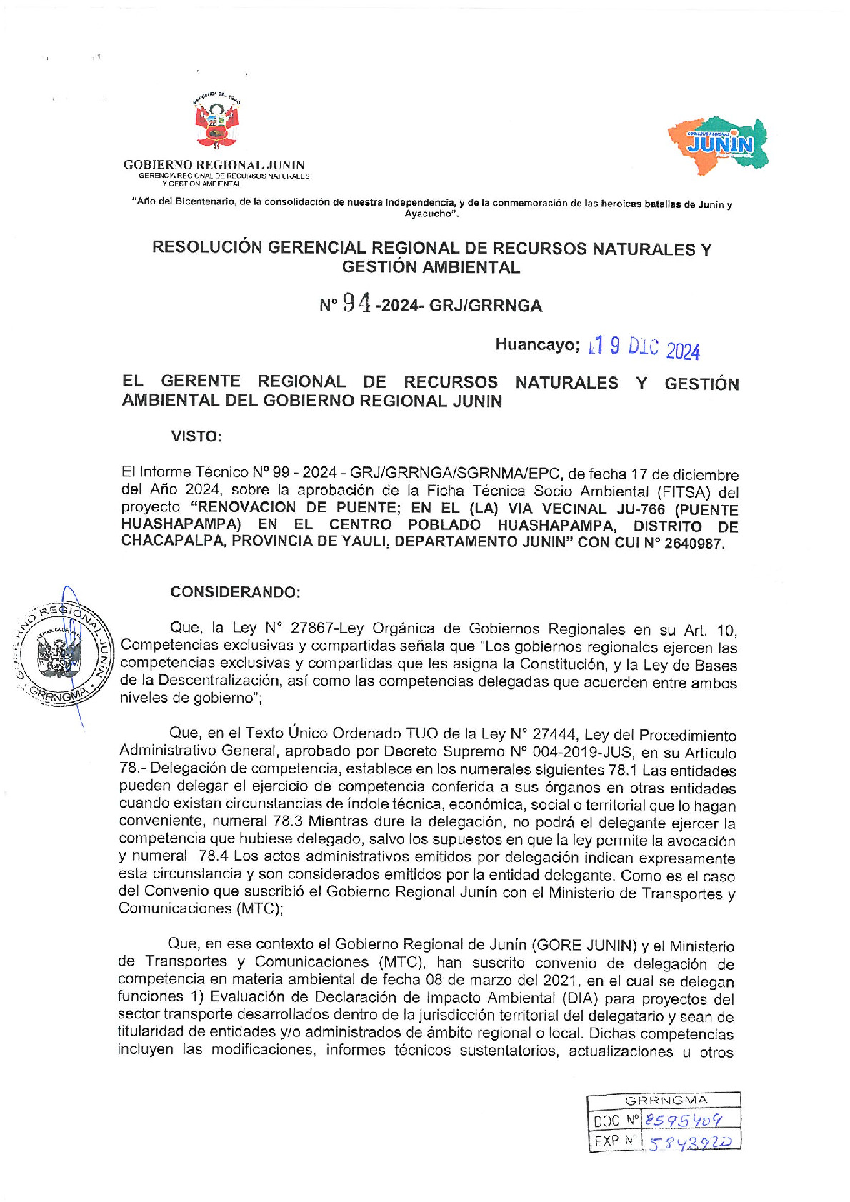 El Gobierno Regional de Junín, a través de la Gerencia Regional de Recursos Naturales y Gestión Ambiental, emitió la Resolución Gerencial Regional N° 94-2024-GRJ/GRRNGA, mediante la cual otorga la conformidad a la Ficha Técnica Socio Ambiental (FITSA) para el proyecto "Renovación de puente; en el (la) vía vecinal JU-766 (Puente Huashapampa) en el Centro Poblado Huashapampa". La obra, ubicada en el distrito de Chacapalpa, provincia de Yauli, cuenta con el Código Único de Inversión (CUI) N° 2640987. Esta certificación ambiental, sustentada en el Informe Técnico N° 99-2024, asegura que los trabajos de infraestructura se realicen bajo estrictos compromisos de protección del entorno natural y cumplimiento de la normativa vigente, reafirmando el compromiso de la gestión regional con la integración vial y el bienestar de las comunidades de la provincia de Yauli.