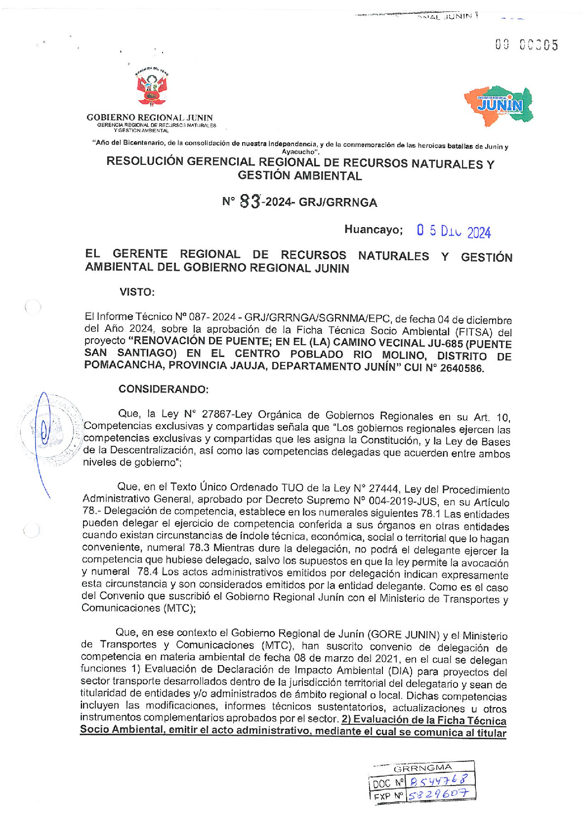 El Gobierno Regional de Junín, a través de la Gerencia Regional de Recursos Naturales y Gestión Ambiental, emitió la Resolución Gerencial Regional N° 83-2024-GRJ/GRRNGA, mediante la cual otorga la conformidad a la Ficha Técnica Socio Ambiental (FITSA) para el proyecto "Renovación de puente; en el (la) camino vecinal JU-685 (Puente San Santiago) en el Centro Poblado Río Molino". La obra, ubicada en el distrito de Pomacancha, provincia de Jauja, cuenta con el Código Único de Inversión (CUI) N° 2640586. Esta certificación ambiental, sustentada en el Informe Técnico N° 087-2024, asegura que los trabajos de infraestructura se realicen bajo estrictos compromisos de protección del entorno natural y manejo de residuos, reafirmando el compromiso de la gestión regional con la integración vial y el desarrollo sostenible de las comunidades altoandinas.