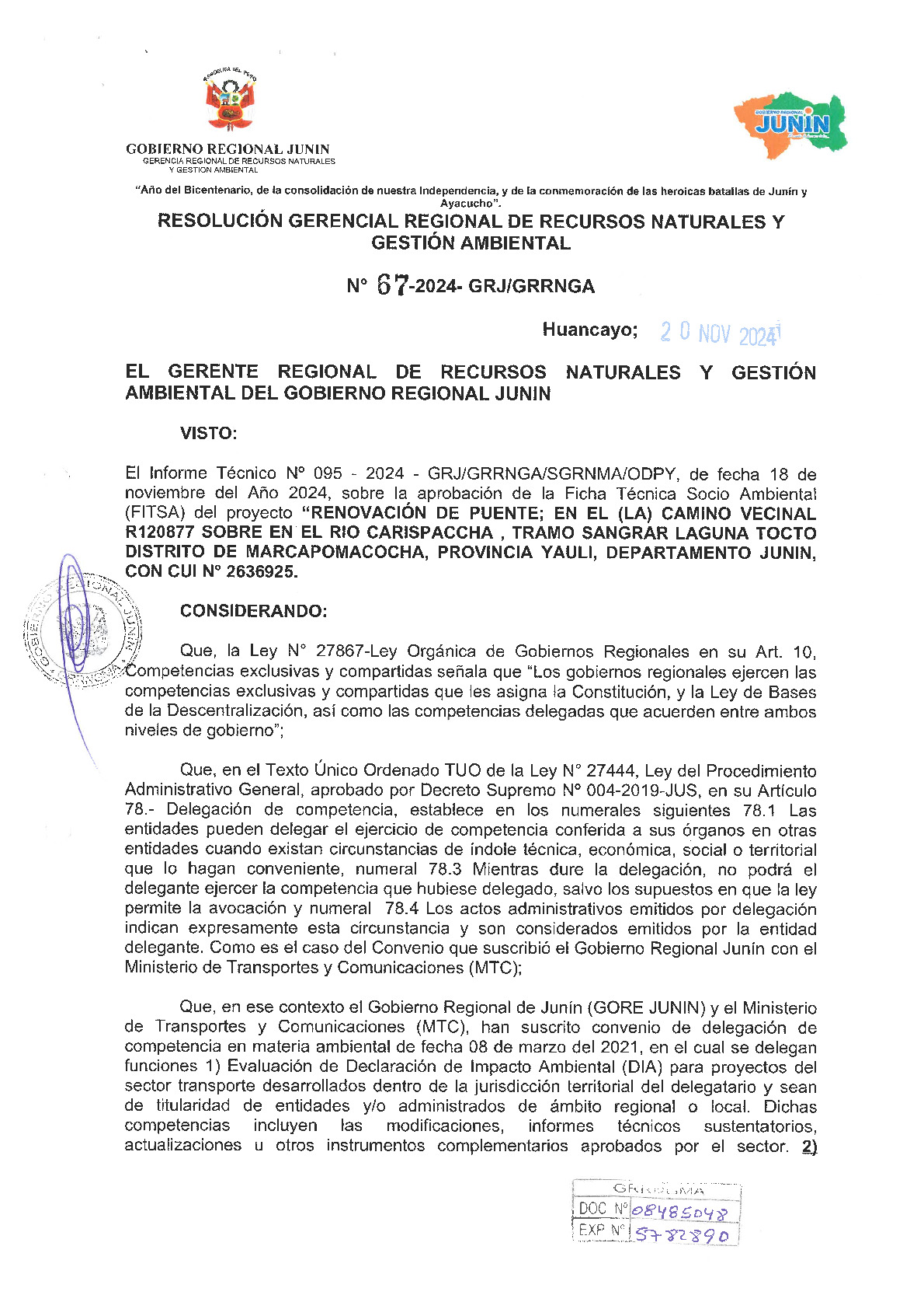 El Gobierno Regional de Junín, a través de la Gerencia Regional de Recursos Naturales y Gestión Ambiental, emitió la Resolución Gerencial Regional N° 67-2024-GRJ/GRRNGA, otorgando la conformidad a la Ficha Técnica Socio Ambiental (FITSA) para el proyecto "Renovación de puente; en el (la) camino vecinal R120877 sobre el río Carispaccha, tramo Sangrar – Laguna Tocto". La obra, ubicada en el distrito de Marcapomacocha, provincia de Yauli, cuenta con el Código Único de Inversión (CUI) N° 2636925. Esta certificación ambiental, sustentada en el Informe Técnico N° 095-2024, asegura que los trabajos de infraestructura se realicen bajo estrictos compromisos de protección del entorno natural y manejo de residuos, reafirmando el compromiso de la gestión regional con la seguridad vial y el desarrollo sostenible de las zonas altoandinas.