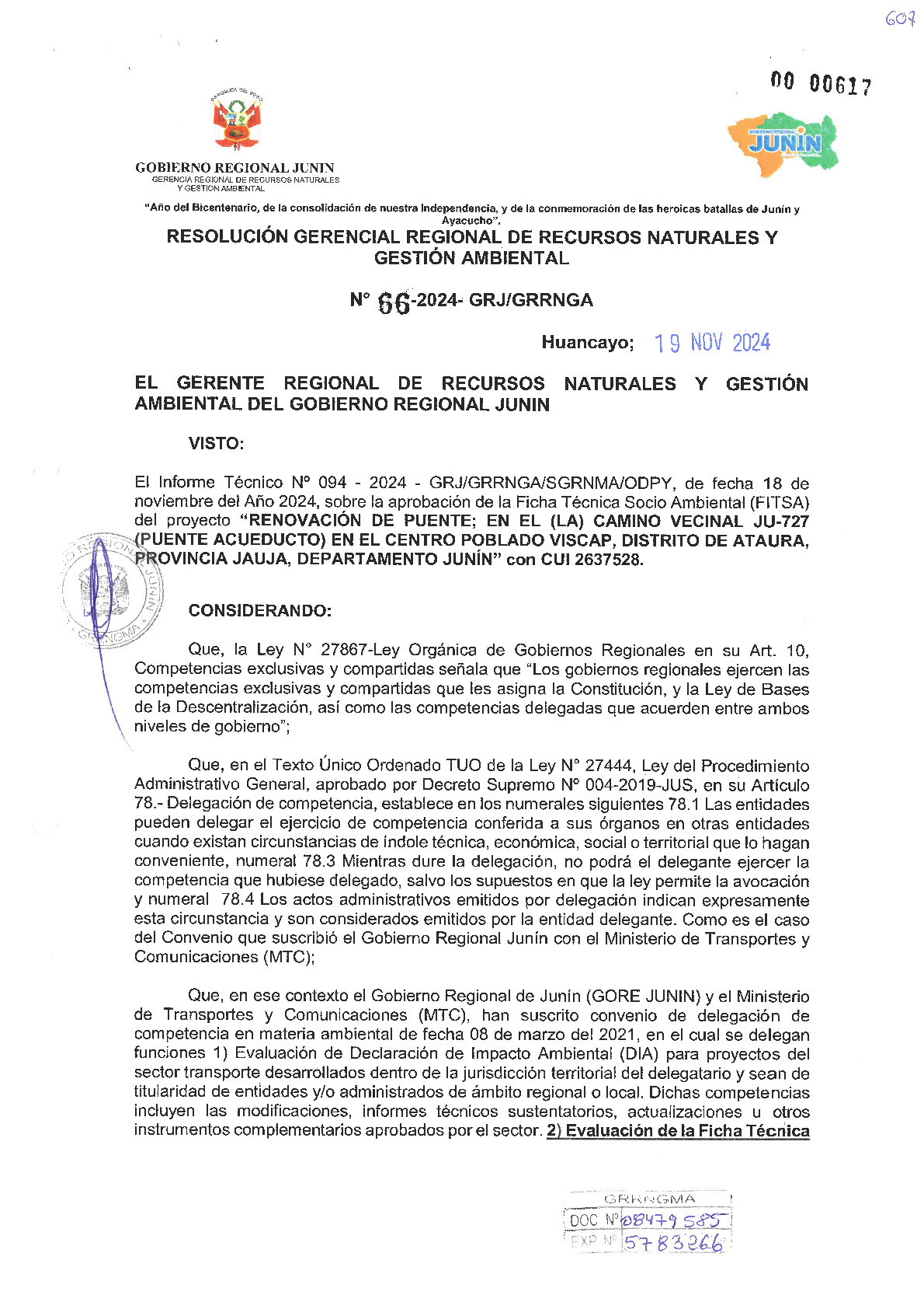 El Gobierno Regional de Junín, a través de la Gerencia Regional de Recursos Naturales y Gestión Ambiental, emitió la Resolución Gerencial Regional N° 66-2024-GRJ/GRRNGA, otorgando la conformidad a la Ficha Técnica Socio Ambiental (FITSA) para el proyecto denominado "Renovación de puente; en el (la) camino vecinal JU-727 (Puente Acueducto) en el centro poblado Viscap". La obra, ubicada en el distrito de Ataura, provincia de Jauja, cuenta con el Código Único de Inversión (CUI) N° 2637528. Esta certificación ambiental, sustentada en el Informe Técnico N° 094-2024, es un paso fundamental para garantizar que los trabajos de infraestructura se ejecuten bajo estrictos compromisos de protección del entorno natural y manejo de residuos, reafirmando el compromiso del Gobierno Regional de Junin con la seguridad vial y el desarrollo sostenible de las comunidades rurales de la región.