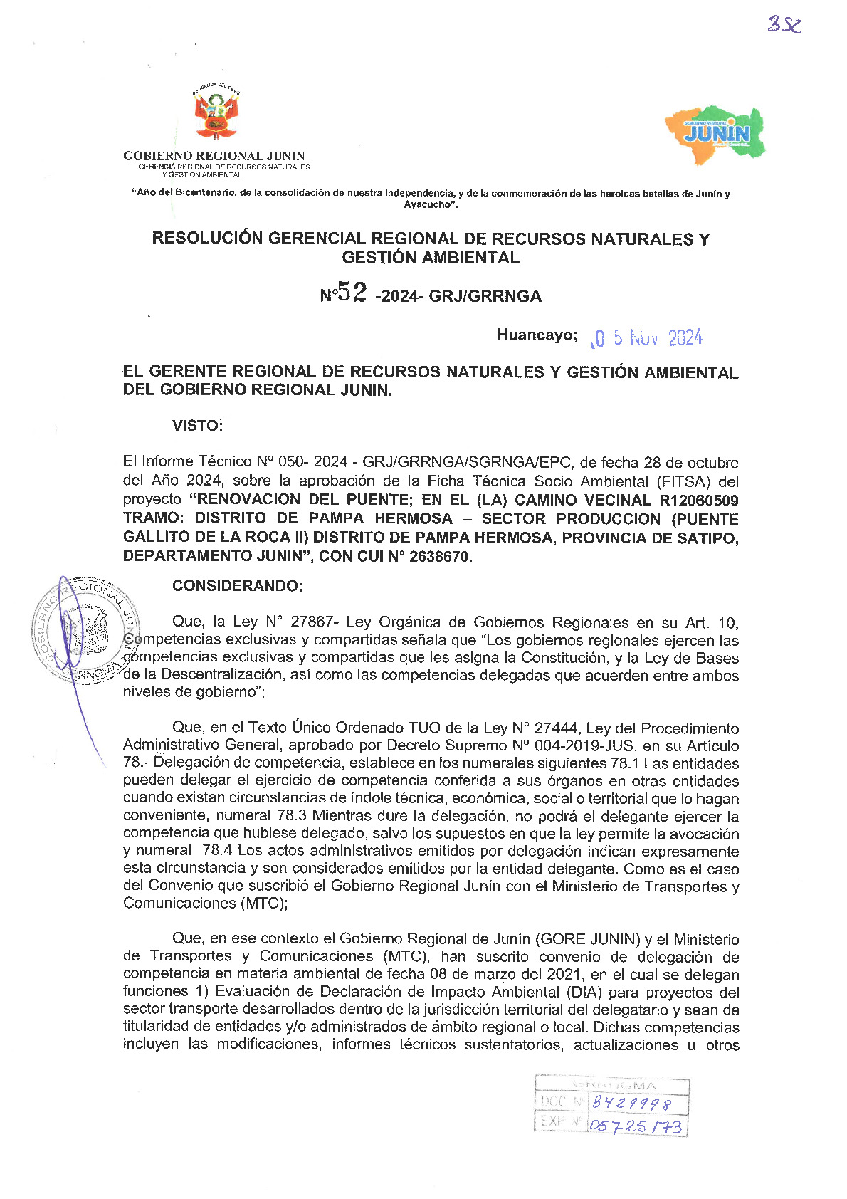 El Gobierno Regional de Junín, a través de la Gerencia Regional de Recursos Naturales y Gestión Ambiental, emitió la Resolución Gerencial Regional N° 52-2024-GRJ/GRRNGA, otorgando la conformidad a la Ficha Técnica Socio Ambiental (FITSA) para el proyecto denominado "Renovación del puente; en el (la) camino vecinal R12060509 tramo: distrito de Pampa Hermosa sector producción (Puente Gallito de la Roca II)". La obra, ubicada en el distrito de Pampa Hermosa, provincia de Satipo, cuenta con el Código Único de Inversión (CUI) N° 2638670. Esta certificación ambiental, sustentada en el Informe Técnico N° 050-2024, es un paso fundamental para garantizar que los trabajos de infraestructura se ejecuten bajo estrictos compromisos de protección del entorno natural y manejo de residuos, reafirmando el compromiso del Gobierno Regional de Junin con la seguridad vial y el desarrollo sostenible de las comunidades rurales de la región.