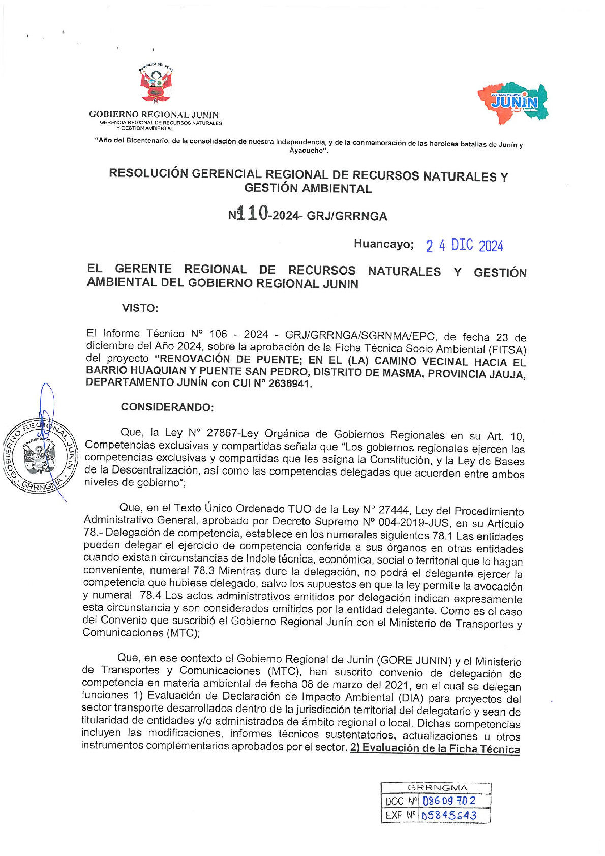 El Gobierno Regional de Junín, a través de la Gerencia Regional de Recursos Naturales y Gestión Ambiental, emitió la Resolución Gerencial Regional N° 110-2024-GRJ/GRRNGA, otorgando la conformidad a la Ficha Técnica Socio Ambiental (FITSA) para el proyecto "Renovación de puente; en el (la) camino vecinal hacia el barrio Huaquián y Puente San Pedro". La obra, ubicada en el distrito de Masma, provincia de Jauja, cuenta con el Código Único de Inversión (CUI) N° 2636941. Esta certificación ambiental, sustentada en el Informe Técnico N° 106-2024, asegura que los trabajos de infraestructura se ejecuten bajo estrictos compromisos de protección del entorno natural y manejo de residuos, reafirmando el compromiso de la gestión regional con la seguridad vial y el desarrollo sostenible de las comunidades altoandinas.