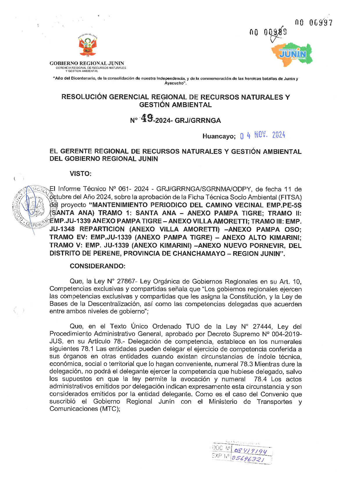 La Gerencia Regional de Recursos Naturales y Gestión Ambiental del Gobierno Regional de Junín, mediante la Resolución Gerencial Regional N° 49-2024-GRJ/GRRNGA, otorgó la conformidad a la Ficha Técnica Socio Ambiental (FITSA) y la certificación ambiental para el mantenimiento periódico de diversos tramos de caminos vecinales que conectan Santa Ana, Pampa Tigre, Villa Amoretti y Pampa Oso, en los distritos de Perené y San Luis de Shuaro (Chanchamayo). Esta aprobación se emitió tras determinar que el proyecto cumple con las normas de protección ambiental para el sector transporte, obligando a la entidad ejecutora a implementar medidas de mitigación de impactos, gestionar adecuadamente los residuos y presentar informes trimestrales de cumplimiento para garantizar la sostenibilidad ambiental de la infraestructura vial.