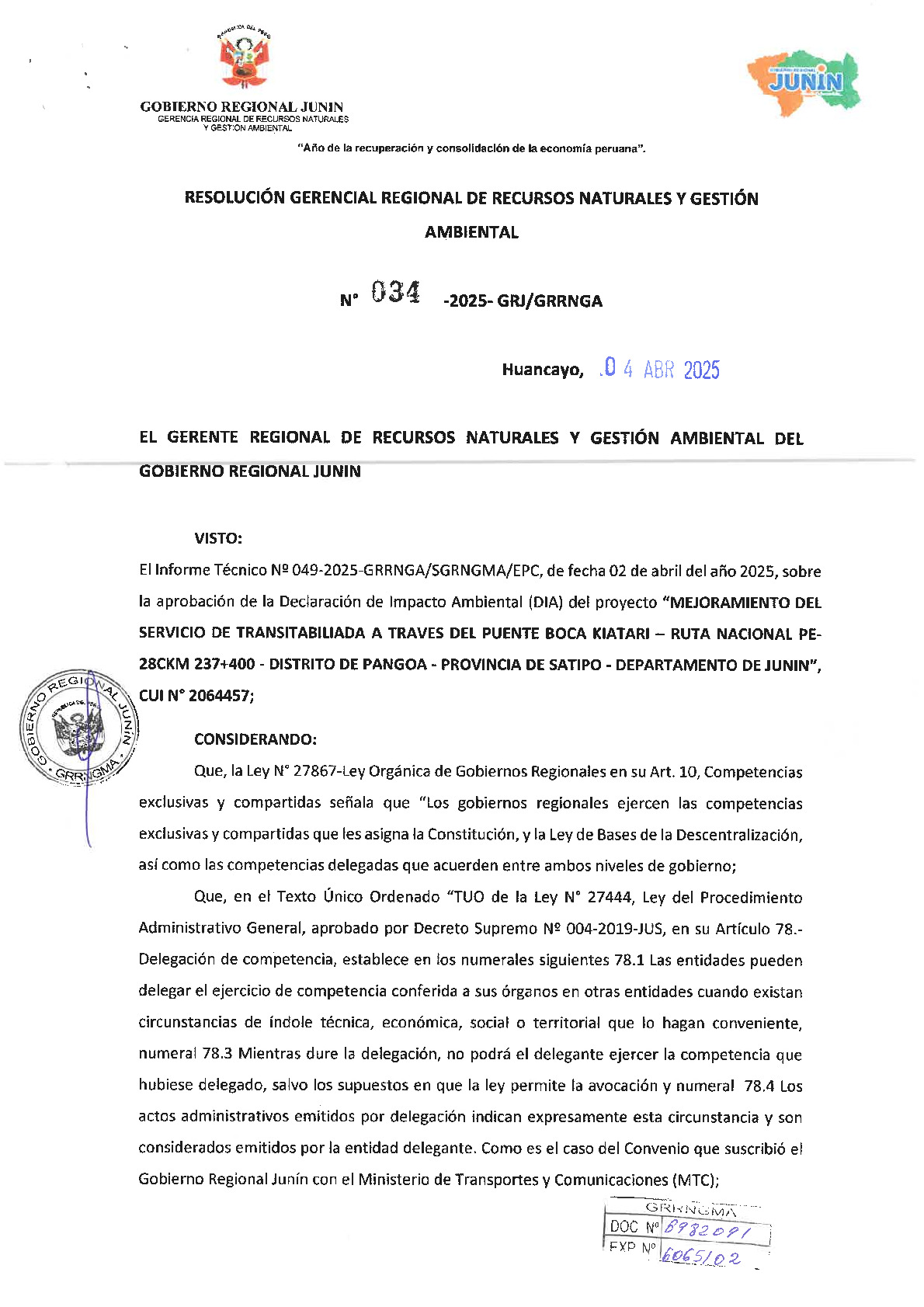 Mediante la Resolución Gerencial Regional N° 034-2025-GRJ/GRRNGA, con fecha 04 de abril de 2025, el Gobierno Regional de Junín aprobó la Declaración de Impacto Ambiental (DIA) y otorgó la certificación ambiental al proyecto "Mejoramiento del servicio de transitabilidad a través del Puente Boca Kiatari - Ruta Nacional PE-28C km 237+400", ubicado en el distrito de Pangoa, provincia de Satipo. Esta aprobación, respaldada por el Informe Técnico N° 049-2025, valida la viabilidad ambiental de la obra tras confirmarse que no afecta áreas naturales protegidas ni recursos hídricos significativos. Con este acto administrativo, el titular del proyecto queda obligado a cumplir con el Plan de Manejo Ambiental y a obtener las licencias complementarias necesarias antes del inicio de las actividades, garantizando así una ejecución responsable con el entorno.