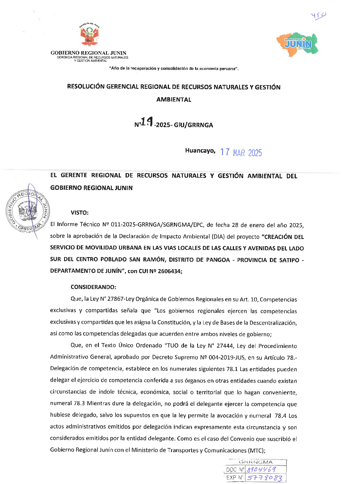 El Gobierno Regional de Junín, a través de la Gerencia Regional de Recursos Naturales y Gestión Ambiental, aprobó mediante la Resolución Gerencial Regional N° 14-2025-GRJ/GRRNGA la Declaración de Impacto Ambiental (DIA) para el proyecto de "Creación del servicio de movilidad urbana en las vías locales de las calles y avenidas del lado sur del centro poblado San Ramón", en el distrito de Pangoa, provincia de Satipo. Esta decisión se sustenta en que la propuesta vial no se encuentra dentro de áreas naturales protegidas ni afectará cuerpos de agua, estableciendo que el titular del proyecto debe cumplir obligatoriamente con el Plan de Manejo Ambiental para mitigar impactos negativos. Cabe precisar que esta certificación otorga exclusivamente la viabilidad ambiental, por lo que la entidad ejecutora deberá gestionar aún las licencias y permisos correspondientes antes de iniciar formalmente las obras físicas.