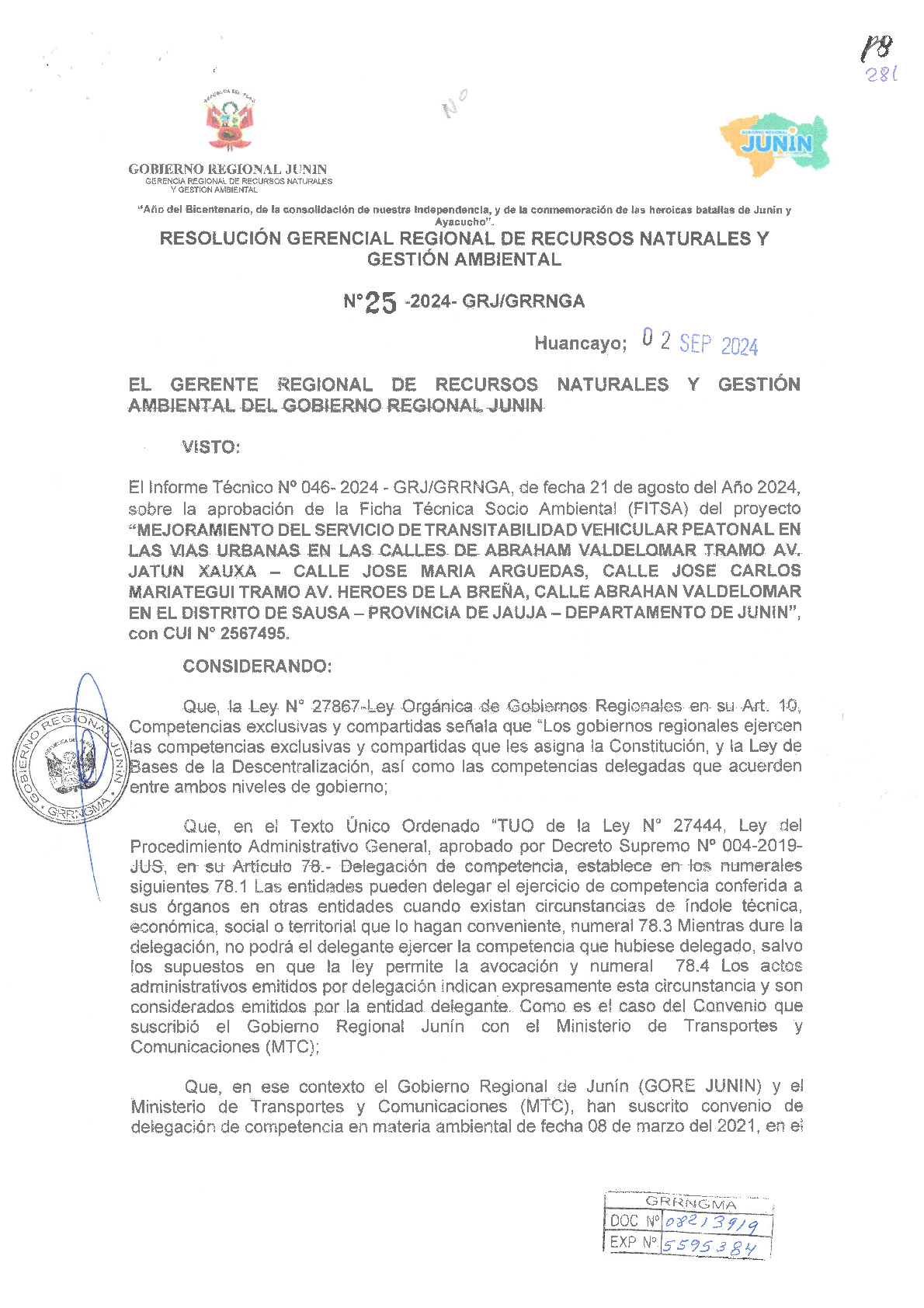 El Gobierno Regional de Junín, mediante la Resolución Gerencial Regional N° 25-2024-GRJ/GRRNGA emitida el 2 de septiembre de 2024, aprobó la Ficha Técnica Socio Ambiental (FITSA) para el proyecto de mejoramiento de la transitabilidad vehicular y peatonal en diversas calles del distrito de Sausa, Jauja. Esta certificación ambiental, sustentada en el Informe Técnico Nº 046-2024-GRJ/GRRNGA, valida que la obra —que intervendrá vías clave como Abraham Valdelomar y José Carlos Mariátegui— cumple con los requisitos para prevenir impactos ambientales negativos, otorgando así la viabilidad necesaria para que la Municipalidad Distrital de Sausa proceda con la ejecución del proyecto bajo el compromiso de cumplir estrictamente con las medidas de mitigación y seguimiento establecidas.