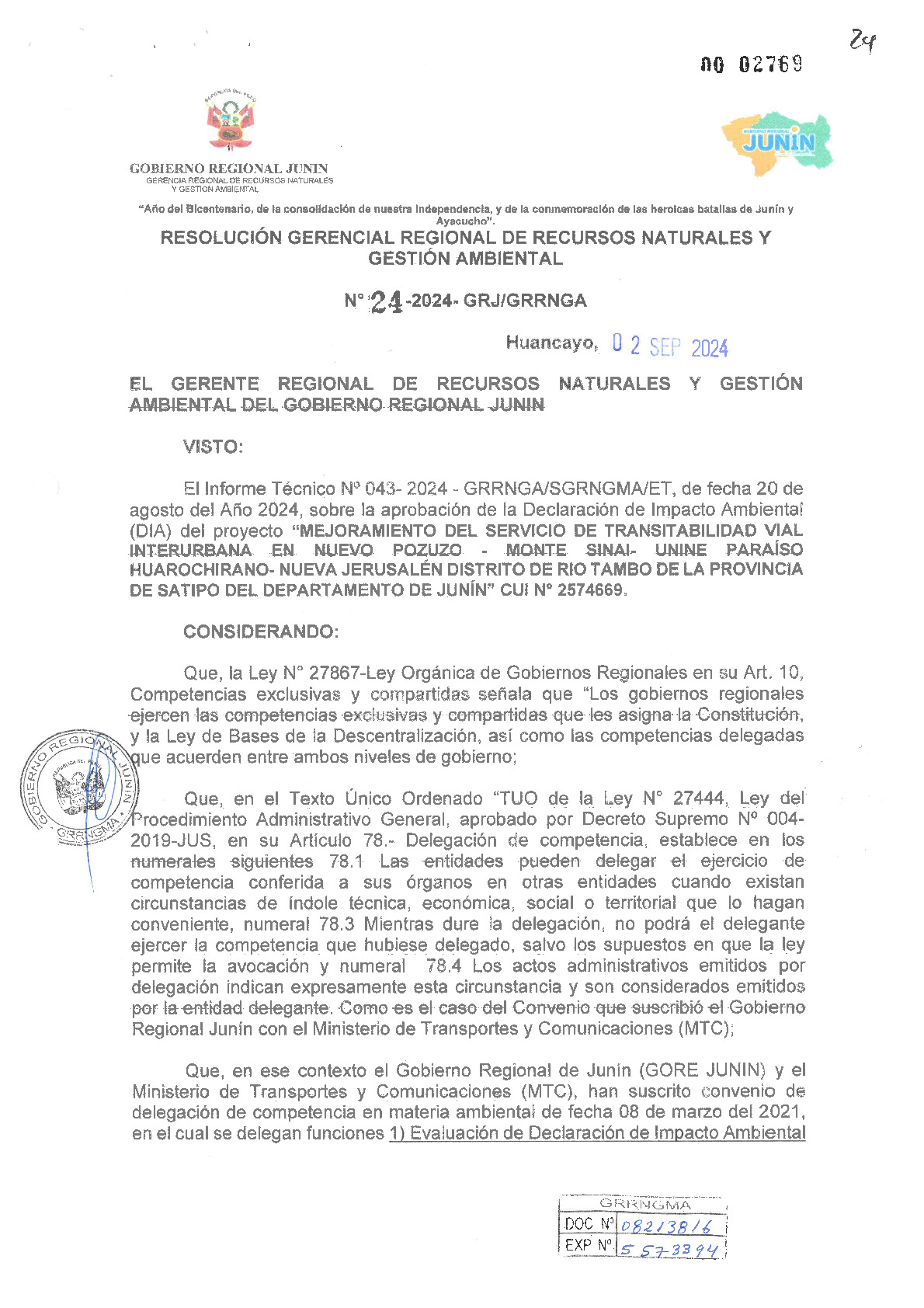 Mediante la Resolución Gerencial Regional N° 24-2024-GRJ/GRRNGA, emitida el 2 de septiembre de 2024 , la Gerencia Regional de Recursos Naturales y Gestión Ambiental del Gobierno Regional de Junín aprobó la Declaración de Impacto Ambiental (DIA) para el proyecto de mejoramiento de la vía interurbana que conecta las localidades de Nuevo Pozuzo, Monte Sinai, Unine Paraíso Huarochirano y Nueva Jerusalén, en el distrito de Río Tambo, Satipo. Esta decisión se fundamentó en que la obra no afecta áreas naturales protegidas ni cuerpos de agua , y faculta a la Municipalidad Distrital de Río Tambo para avanzar con la ejecución del proyecto, siempre que cumpla con el Plan de Manejo Ambiental y se someta a las acciones de supervisión correspondientes.