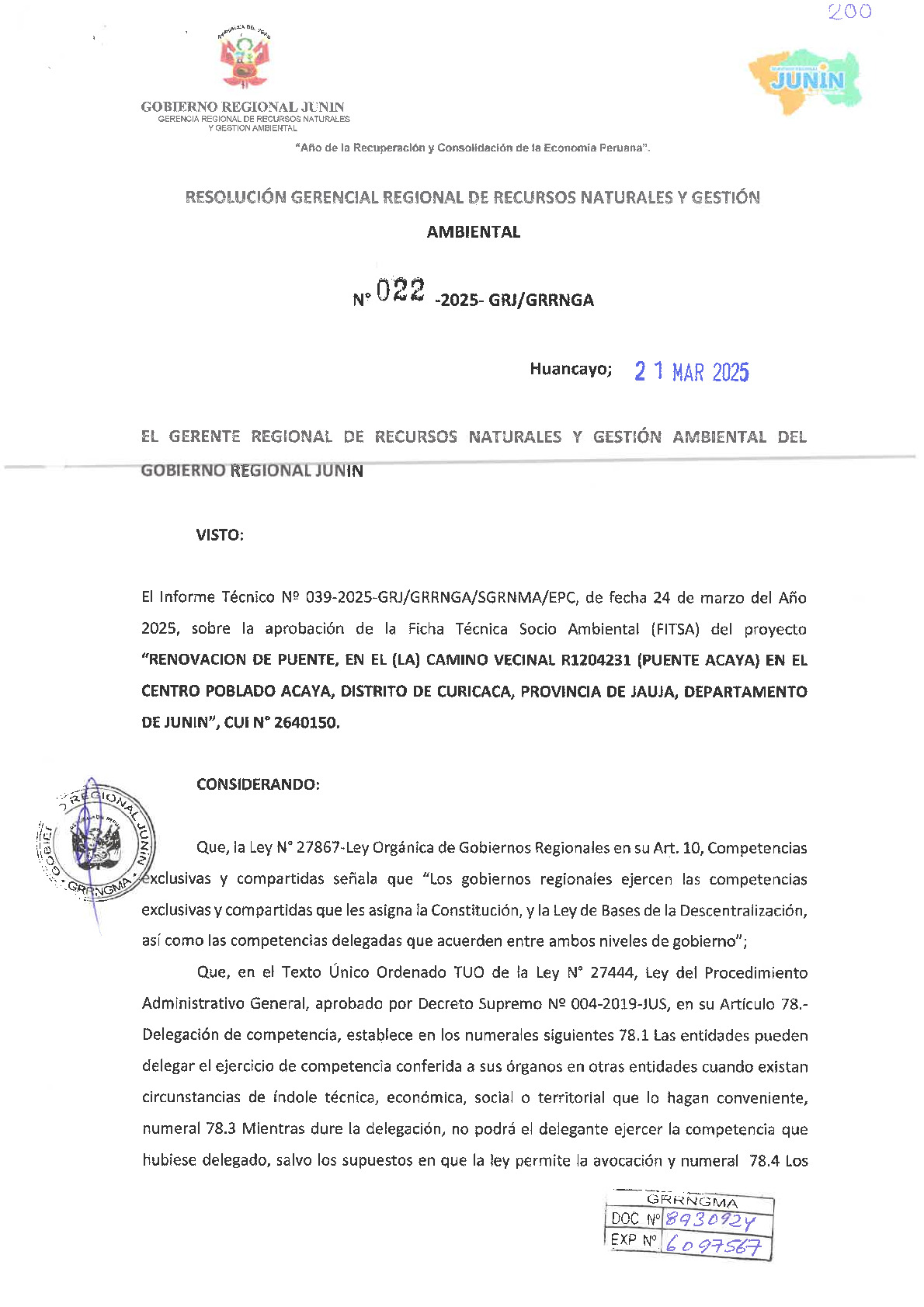 El Gobierno Regional de Junín, a través de la Gerencia Regional de Recursos Naturales y Gestión Ambiental, emitió la Resolución Gerencial Regional N° 022-2025-GRJ/GRRNGA que otorga la conformidad a la Ficha Técnica Socio Ambiental (FITSA) para el proyecto de "Renovación de puente en el camino vecinal R1204231 (Puente Acaya)", ubicado en el distrito de Curicaca, provincia de Jauja. Esta certificación ambiental valida que el proyecto cumple con los estándares de protección del sector transportes al no afectar áreas naturales protegidas ni ecosistemas frágiles, estableciendo que la entidad ejecutora debe implementar obligatoriamente las medidas de mitigación para el manejo de residuos, control de ruidos y emisiones. Con esta resolución, el proyecto obtiene la viabilidad ambiental necesaria para continuar con sus fases administrativas y la gestión de permisos sectoriales antes del inicio de la ejecución física de la obra.