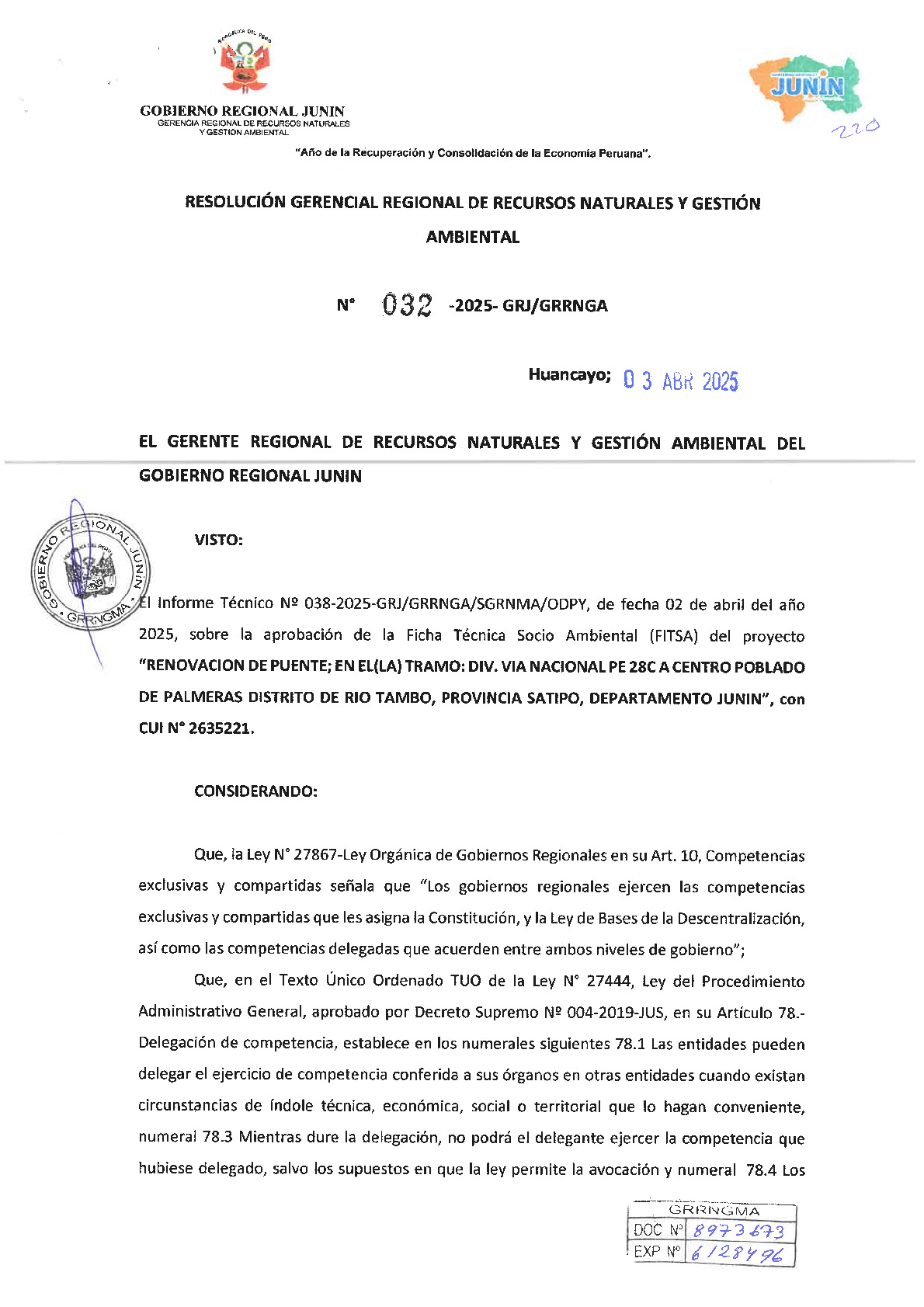 Mediante la Resolución Gerencial Regional N° 032-2025-GRJ/GRRNGA, emitida el 03 de abril de 2025, el Gobierno Regional de Junín otorgó la conformidad a la Ficha Técnica Socio Ambiental (FITSA) y la correspondiente certificación ambiental para el proyecto de inversión "Renovación de Puente; en el tramo: Div. Vía Nacional PE 28C a Centro Poblado de Palmeras", ubicado en el distrito de Río Tambo, provincia de Satipo. Esta decisión, sustentada en el Informe Técnico N° 038-2025 y en las facultades delegadas por el Ministerio de Transportes y Comunicaciones, valida la viabilidad ambiental de la obra (CUI N° 2635221) tras el levantamiento de observaciones por parte de la Municipalidad Distrital de Río Tambo. Con esta resolución, el titular queda obligado a cumplir con las medidas de manejo ambiental y social establecidas, así como a comunicar el inicio de las obras en un plazo de treinta días hábiles para garantizar la adecuada supervisión y fiscalización del proyecto.