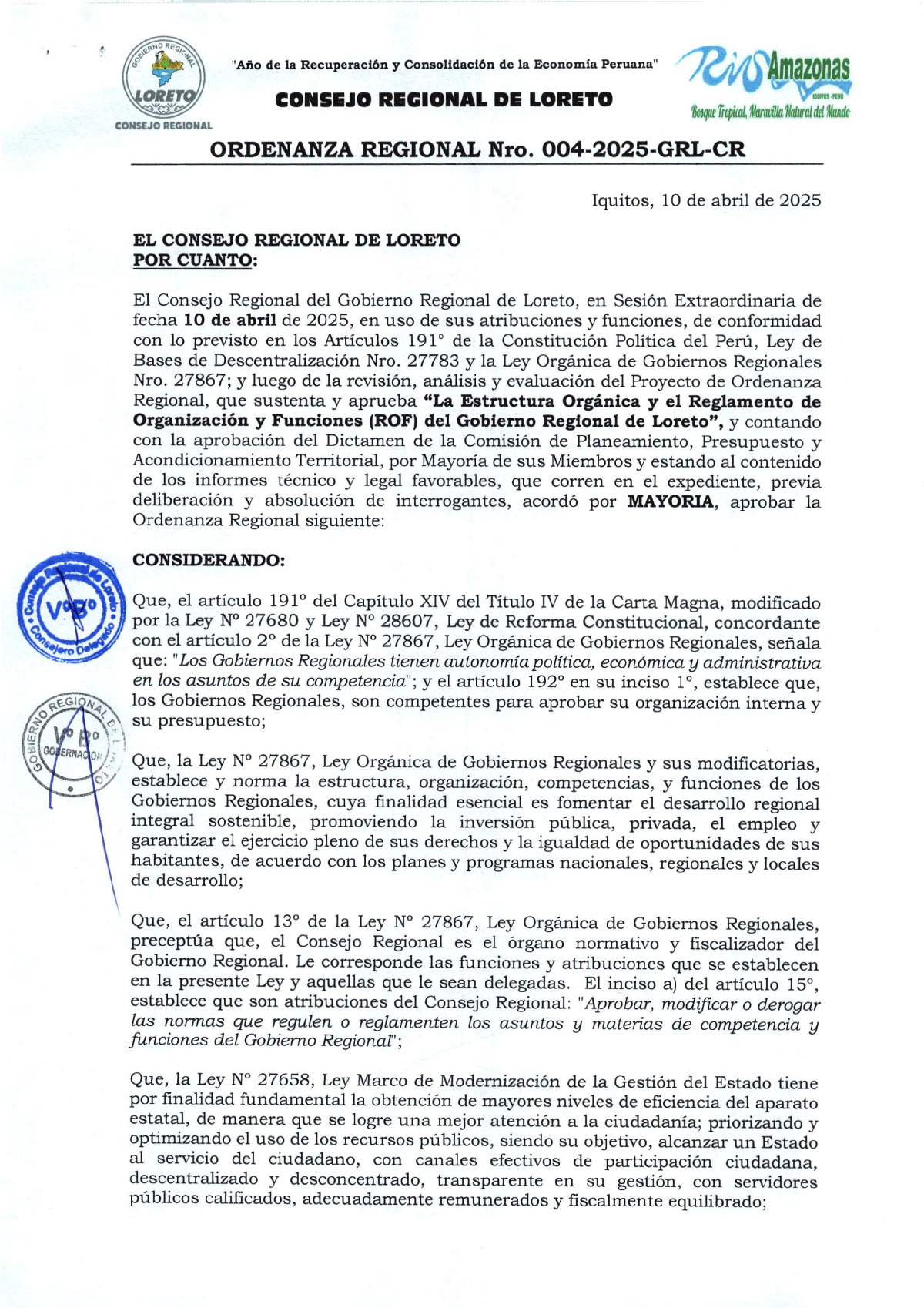 La Ordenanza Regional Nº 004-2025-GRL-CR, aprobada el 10 de abril de 2025 en Iquitos, y publicada en el diario El Peruano el 26 de diciembre del 2025, aprueba la nueva Estructura Orgánica y el Reglamento de Organización y Funciones (ROF) del Gobierno Regional de Loreto. Entre lo más relevante es la unión de la Gerencia Regional de Desarrollo Forestal y de Fauna Silvestre y la Gerencia Regional del Ambiente en la Gerencia Regional de Recursos Naturales y Gestión Ambiental, que es el órgano de línea del Gobierno Regional de Loreto encargado de formular, dirigir, ejecutar y supervisar las políticas, planes y acciones relacionadas con la gestión ambiental y el aprovechamiento sostenible de los recursos naturales en el ámbito regional, conforme al ROF aprobado por la Ordenanza Regional N.º 004-2025-GRL-CR. Su función es promover la climática conservación de la biodiversidad, la protección del ambiente, la gestión sostenible de los recursos forestales, de fauna silvestre y demás recursos naturales, así como la prevención, control y mitigación de impactos ambientales y del cambio, en concordancia con la normativa nacional y regional. Asimismo, coordina y articula con entidades públicas y privadas, emite opinión técnica y ejerce funciones de seguimiento y fiscalización ambiental dentro de las competencias del Gobierno Regional. De esta gerencia dependen la Dirección Regional de Gestión Ambiental, la Dirección Regional de Recursos Naturales y la Unidad de Gestión Forestal y de Fauna Silvestre, como órgano desconcentrado.