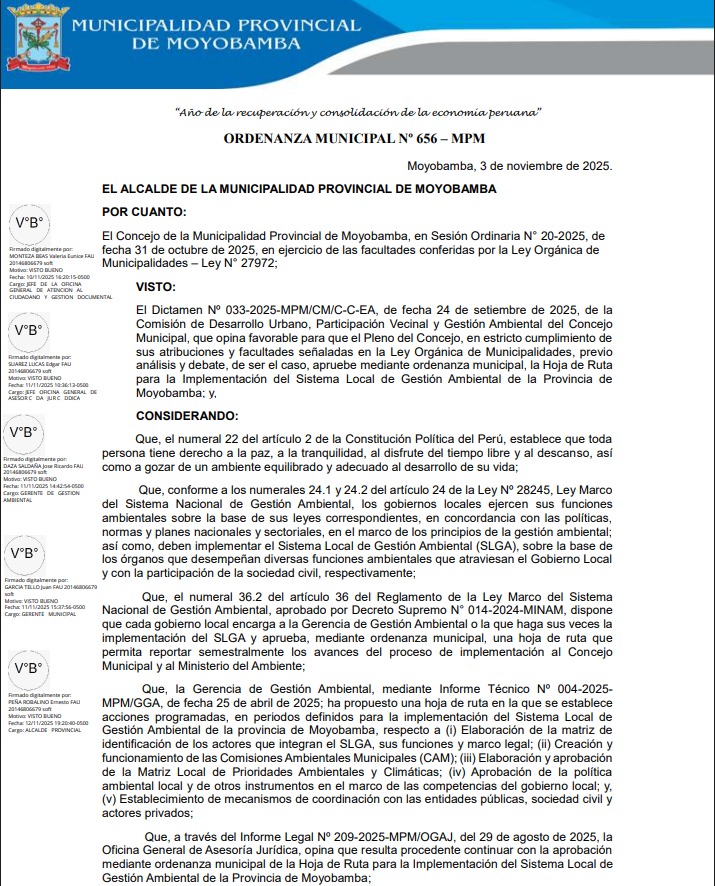 Mediante Ordenanza Municipal N° 656 – MPM, de fecha 3 de noviembre del 2025, la Municipalidad Provincial de Moyobamba aprobó la Hoja de Ruta para implementación del Sistema Local de Gestión Ambiental de la Municipalidad Provincial de Moyobamba. La Hoja de Ruta es un instrumento de planificación estratégica que establece de manera ordenada y progresiva las acciones, responsables, plazos y recursos necesarios para alcanzar objetivos específicos dentro de un proceso de gestión. En el ámbito ambiental municipal, la Hoja de Ruta define las etapas, mecanismos de coordinación y medidas operativas que orientan la implementación del Sistema Local de Gestión Ambiental, garantizando su funcionamiento eficiente, articulado y sostenible en el tiempo.