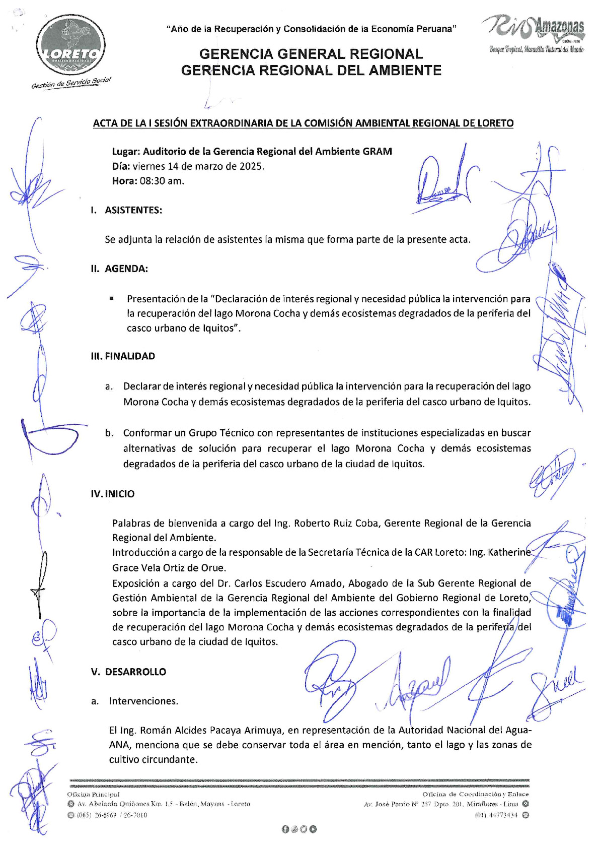 La I Sesión Extraordinaria de la Comisión Ambiental Regional (CAR) Loreto, llevada a cabo el 14 de marzo de 2025, se centró en la problemática ambiental del lago Morona Cocha.