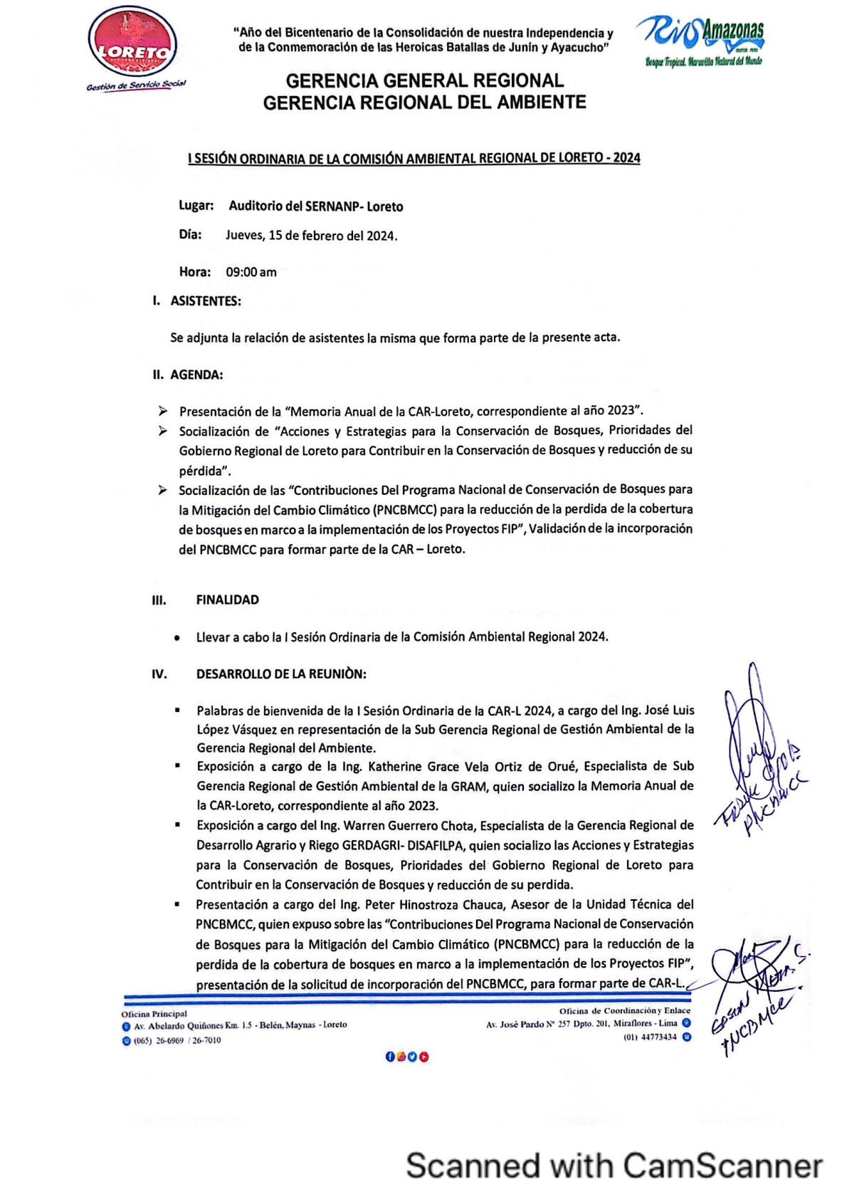 - Queda aprobado por unanimidad la incorporación del Programa Nacional de Bosques para la Mitigación del Cambio Climático como miembro de la Comisión Ambiental Regional de Loreto