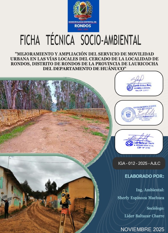 La Gerencia Regional de Recursos Naturales y Gestión Ambiental (GRRNGA) del Gobierno Regional de Huánuco ha otorgado la conformidad a la Ficha Técnica Socio Ambiental (FITSA) para el proyecto "Mejoramiento y Ampliación del Servicio de Movilidad Urbana en las Vías Locales del Cercado de la Localidad de Rondos", mediante la Resolución N.º 210-2025-GRH/GRRNGA del 12 de diciembre de 2025. Esta aprobación, basada en un informe técnico-legal favorable, faculta a la Municipalidad Distrital de Rondos para proceder con las gestiones previas a la ejecución de las obras, tras haber subsanado las observaciones formuladas dentro del proceso de evaluación.