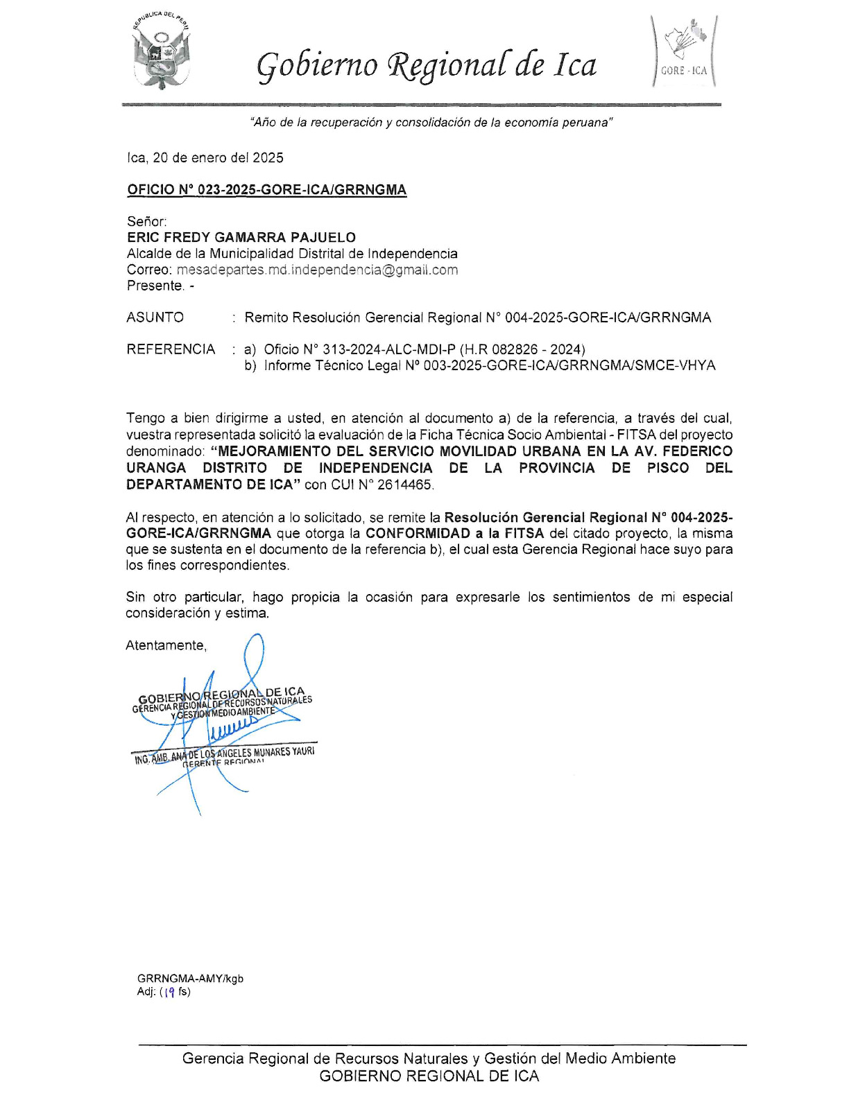 otorgar la conformidad a la ficha socio ambiental -FITSA del proyecto "MEJORAMIENTO DEL SERVICIO DE MOVILIDAD URBANA EN LA AV.FEDERICO URANGA DISTRITO DE INDEPENDENCIA DE LA PROVINCIA DE PISCO DEL DEPARTAMENTO DE ICA" con CUI N° 2614465