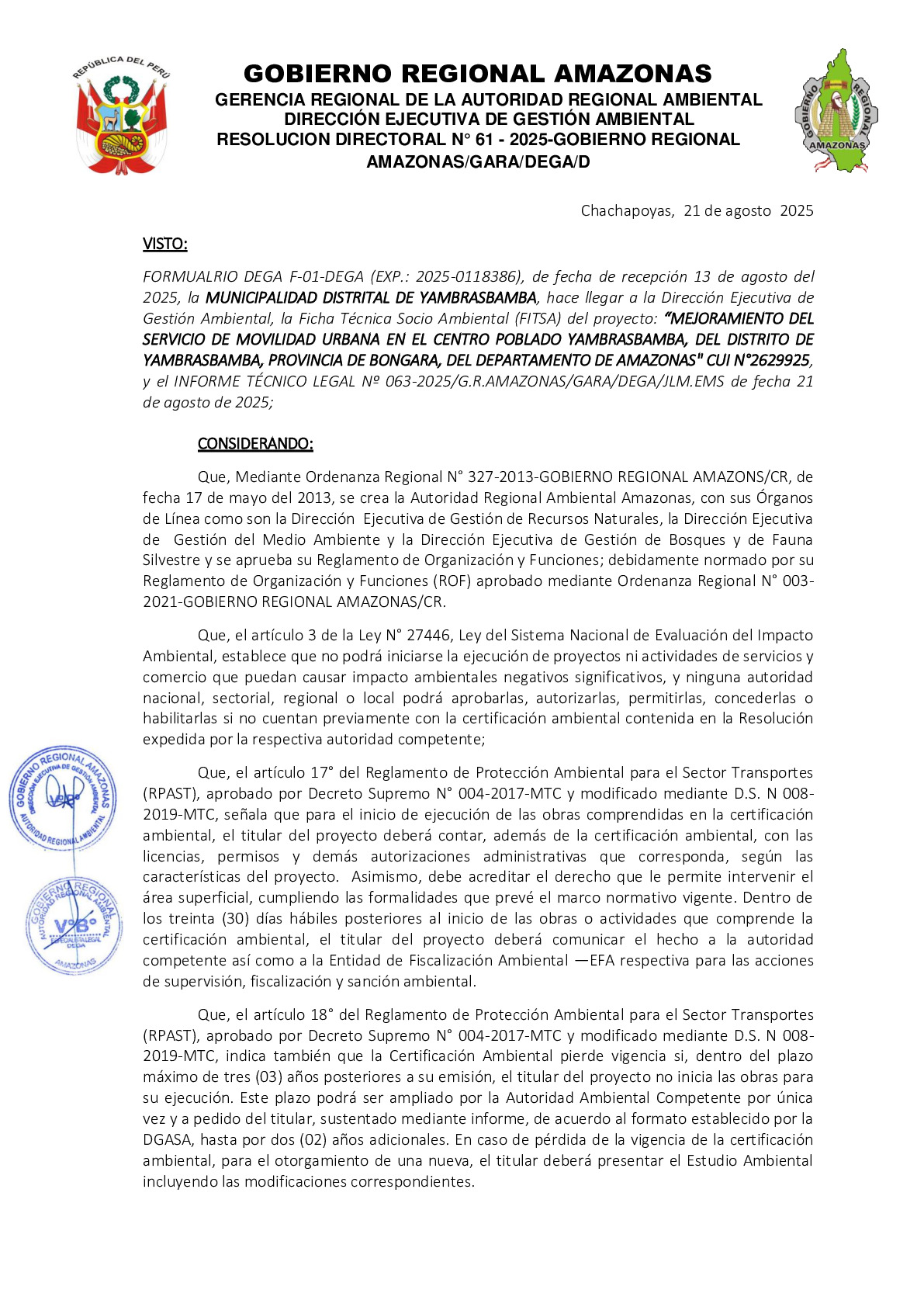 Otorgó la CONFORMIDAD a la Ficha Técnica Socio Ambiental (FITSA) del proyecto: Formulario DEGA F-01-DEGA (13 AGO 2025) (EXP.: 2025- 0118386), de fecha de recepción 13 de agosto del 2025, la Municipalidad Distrital de Yambrasbamba, hace llegar a la Dirección Ejecutiva de Gestión Ambiental, la Ficha Técnica Socio Ambiental (FITSA) del proyecto: “Mejoramiento del Servicio de Movilidad Urbana en el Centro Poblado Yambrasbamba, Del Distrito De Yambrasbamba, Provincia De Bongara, Del Departamento De Amazonas" CUI N°2629925