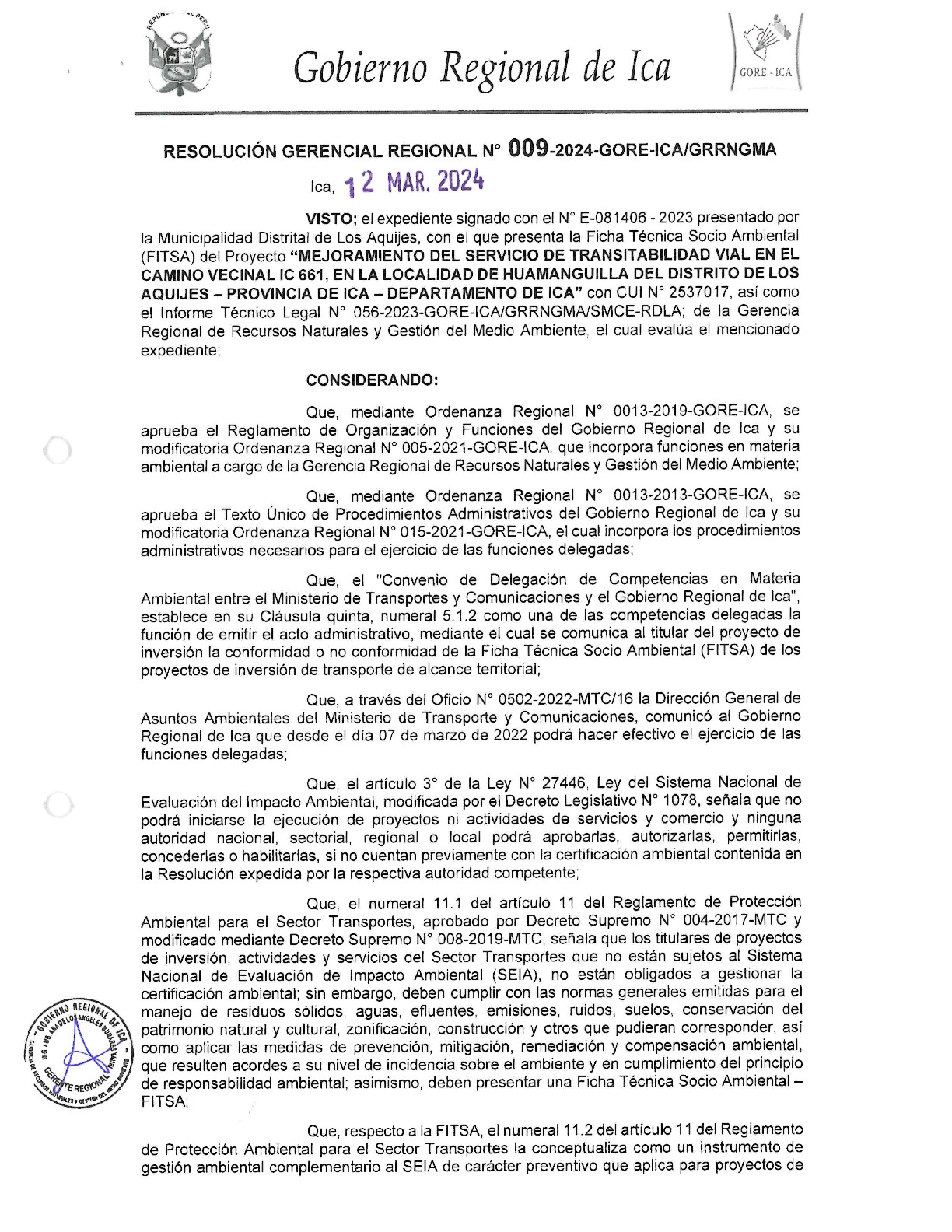 CONFORMIDAD DE LA FITSA "MEJORAMIENTO DEL SERVICIO DE TRANSITABILIDAD VIAL EN EL CAMINO VECINAL IC 661, EN LA LOCALIDAD DE HUAMANGUILLA DEL DISTRITO DE LOS AQUIJES - PROVINCIA DE ICA - DEPARTAMENTO DE ICA"