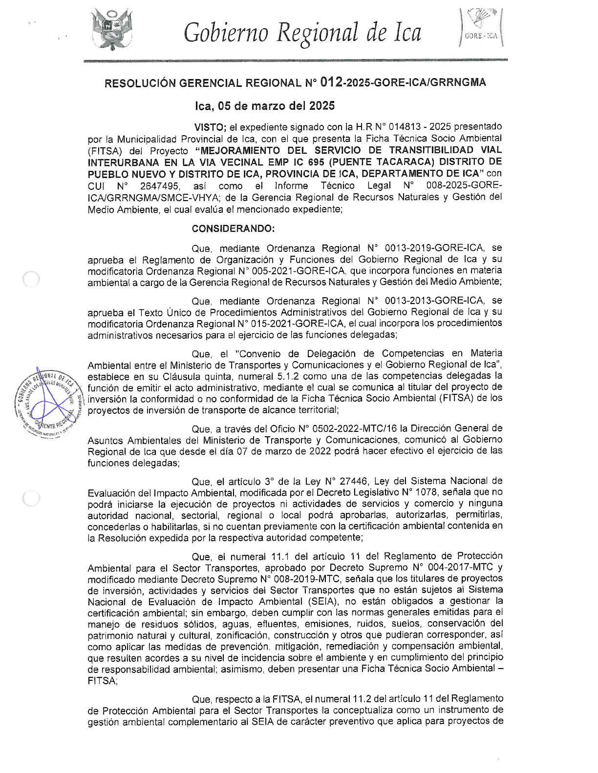 Conformidad a la ficha técnica socio ambiental FITSA del Proyecto MEJORAMIENTO DEL SERVICIO DE TRANSITABILIDAD VIAL INTERURBANA EN LA VIA VECINAL EMP IC 675 (PUENTE TACARACA) DISTRITO DE PUEBLO NUEVO Y DISTRITO DE ICA DE LA PROVINCIA DE ICA DEL DEPARTAMENTO DE ICA 2647495