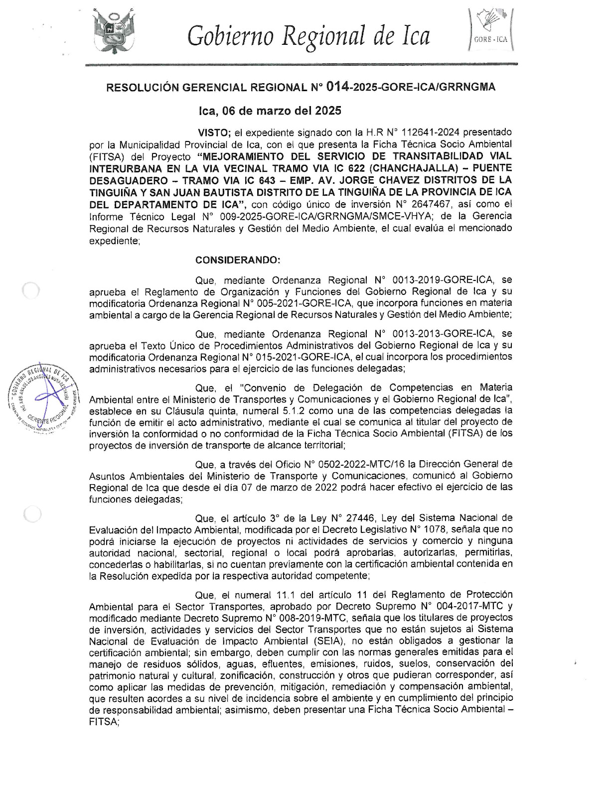 CONFORMIDAD A LA FICHA TECNICA SOCIO AMBIENTAL FITSA DEL PROYECTO "MEJORAMIENTO DEL SERVICIO DE TRANSITABILIDAD VIAL INTERURBANA EN LA VIA VECINAL TRAMO VIA IC 622 (CHANCHAJALLA) – PUENTE DESAGUADERO – TRAMO VIA IC 643 – EMP. AV. JORGE CHAVEZ DISTRITOS DE LA TINGUIÑA Y SAN JUAN BAUTISTA DISTRITO DE LA TINGUIÑA DE LA PROVINCIA DE ICA DEL DEPARTAMENTO DE ICA" con N° CUI 2647467