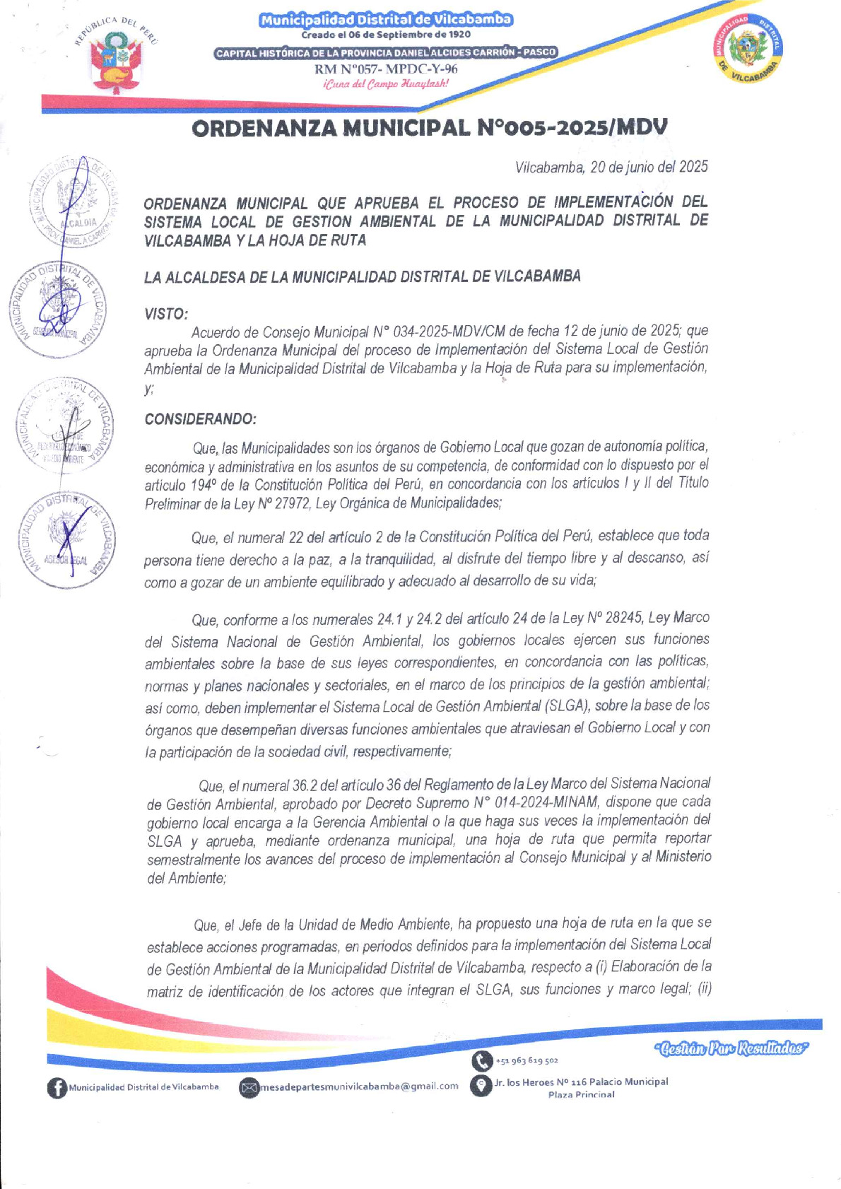 Ordenanza Municipal que aprueba el proceso de implementación del Sistema Local de Gestión Ambiental de la Municipalidad Distrital de Vilcabamba y la Hoja de Ruta para su Implementación.