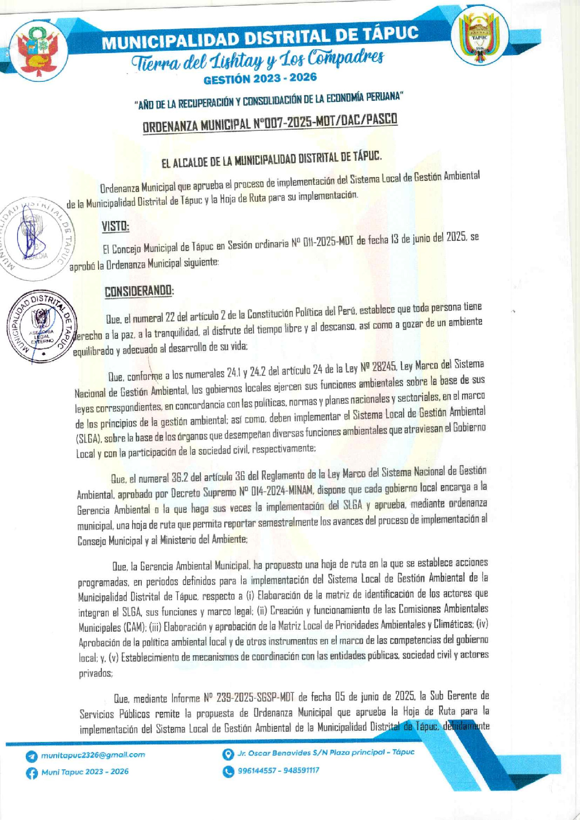 Ordenanza Municipal que aprueba el proceso de implementación del Sistema Local de Gestión Ambiental de la Municipalidad Distrital de Tápuc y la Hoja de Ruta para su Implementación.