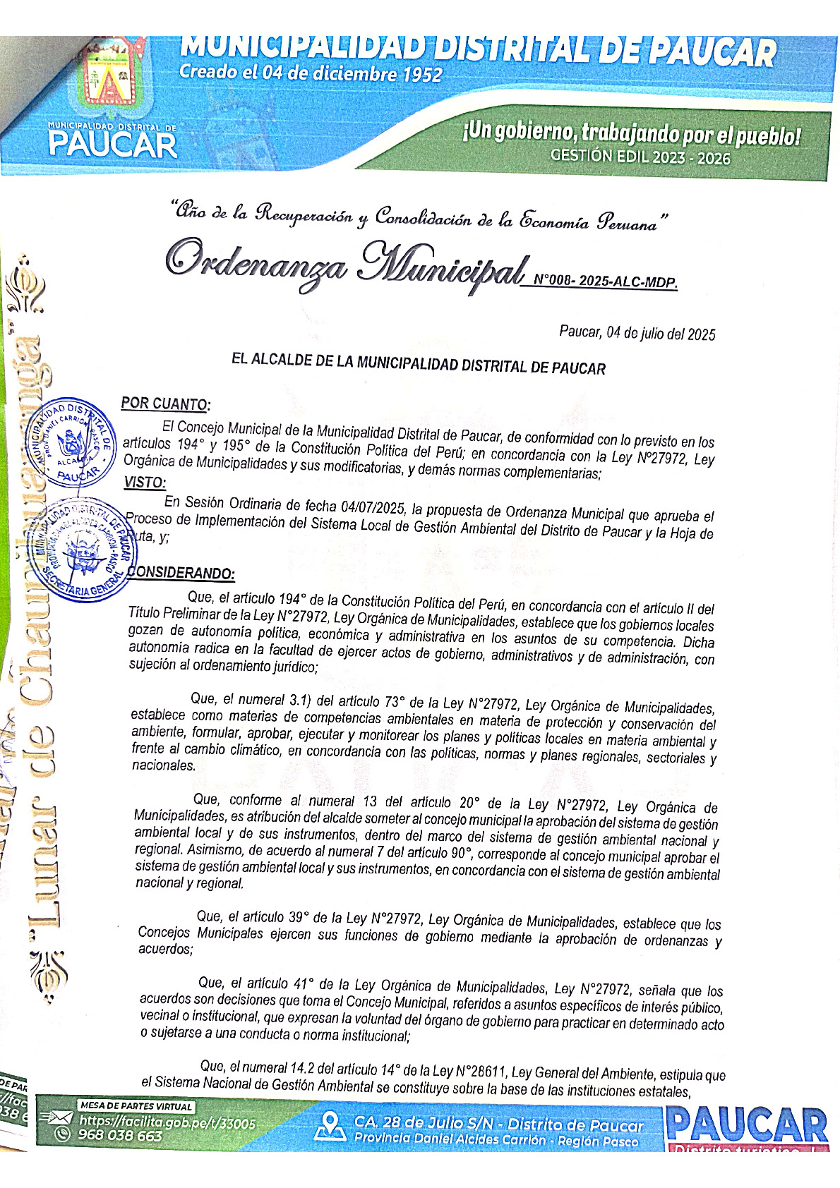 Ordenanza Municipal N° 008-2025-ALC-MDP.
