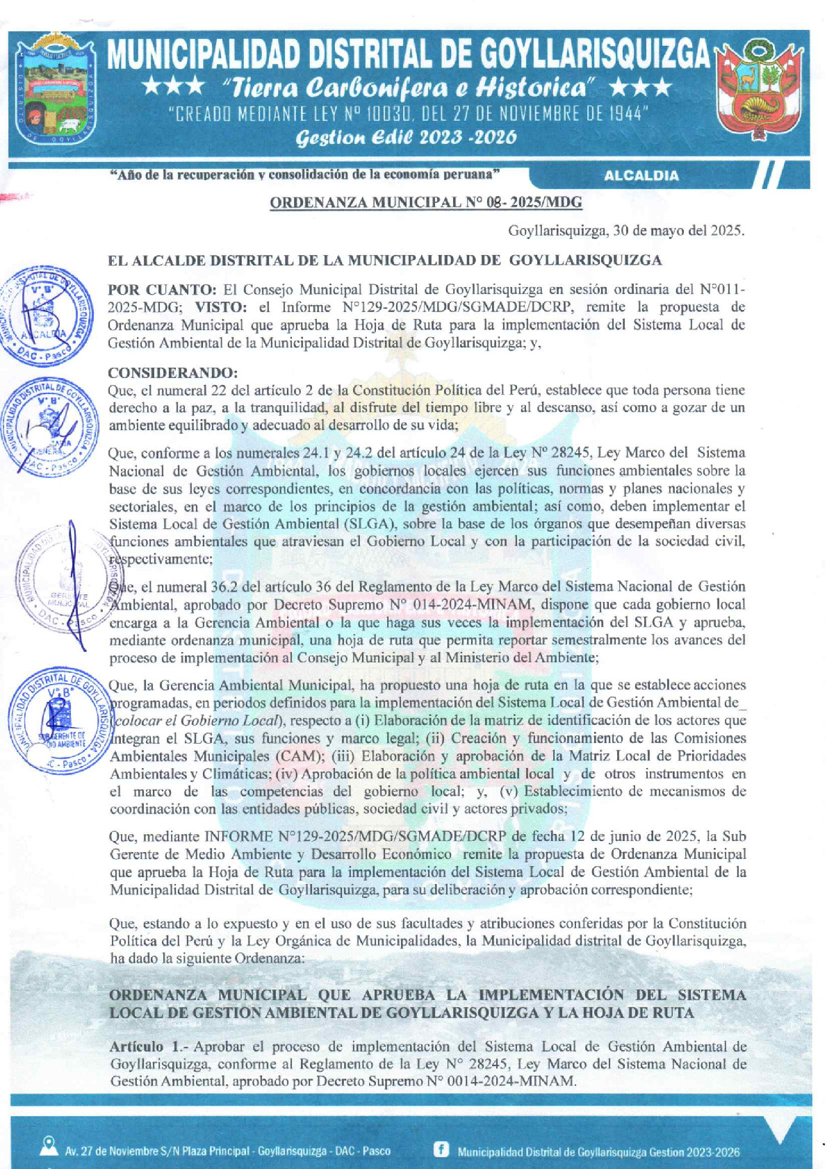 Ordenanza Municipal que aprueba el proceso de implementación del Sistema Local de Gestión Ambiental de la Municipalidad Distrital de Goyllarisquizga y la Hoja de Ruta para su Implementación.