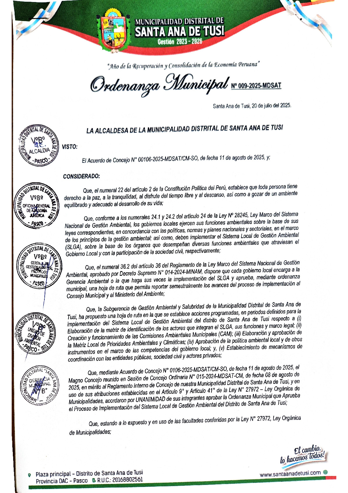 Ordenanza Municipal que aprueba el proceso de implementación del Sistema Local de Gestión Ambiental de la Municipalidad Distrital de Santa Ana de Tusi y la Hoja de Ruta para su Implementación.