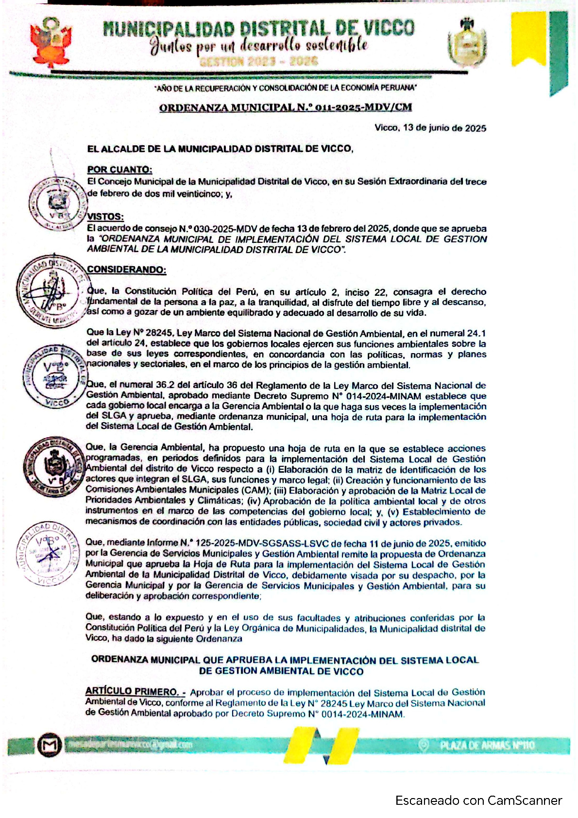 Ordenanza Municipal que aprueba el proceso de implementación del Sistema Local de Gestión Ambiental de la Municipalidad Distrital de Vicco y la Hoja de Ruta para su Implementación.