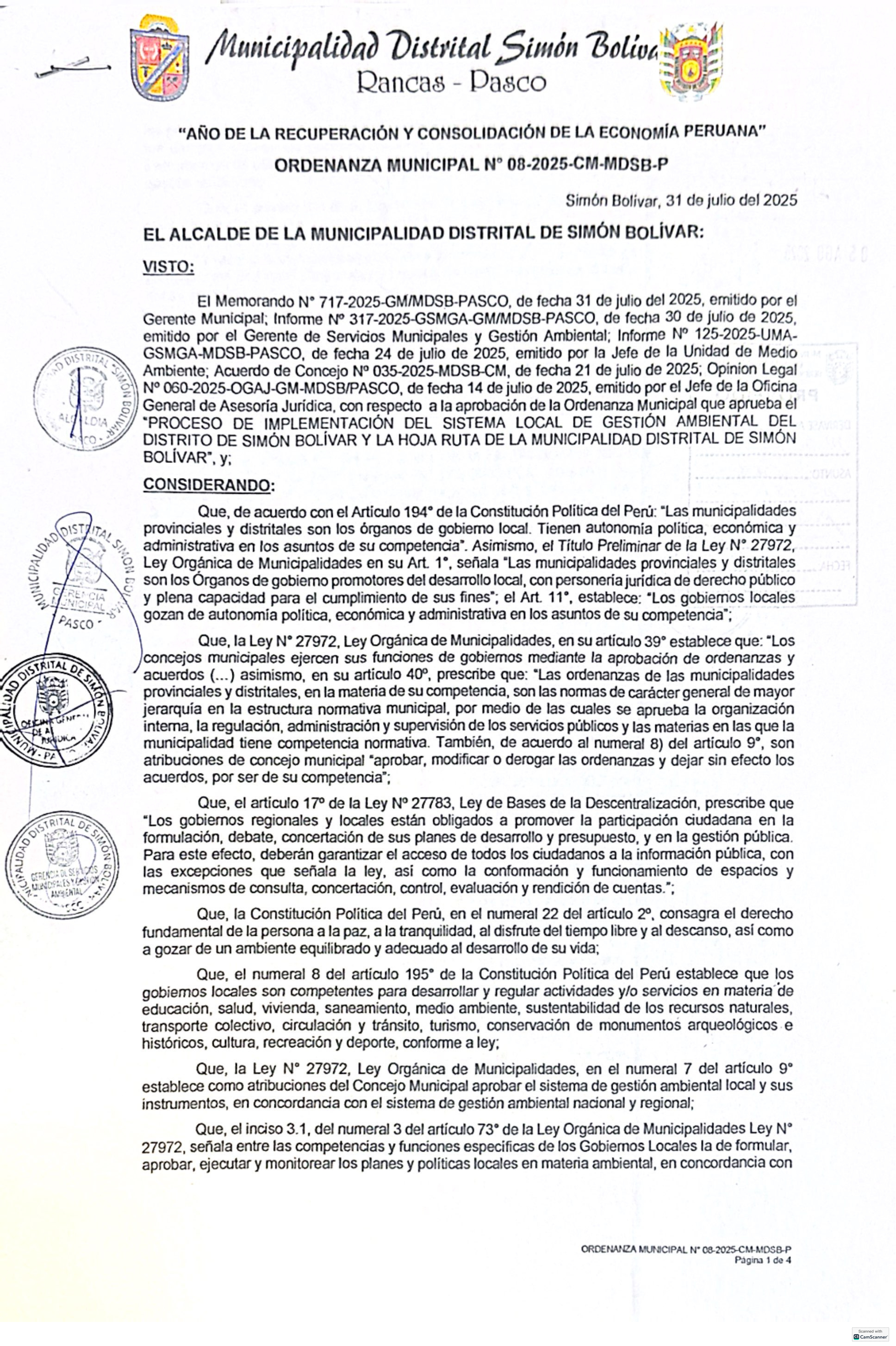 Ordenanza Municipal que aprueba el proceso de implementación del Sistema Local de Gestión Ambiental de la Municipalidad Distrital de Simón Bolívar y la Hoja de Ruta para su Implementación.