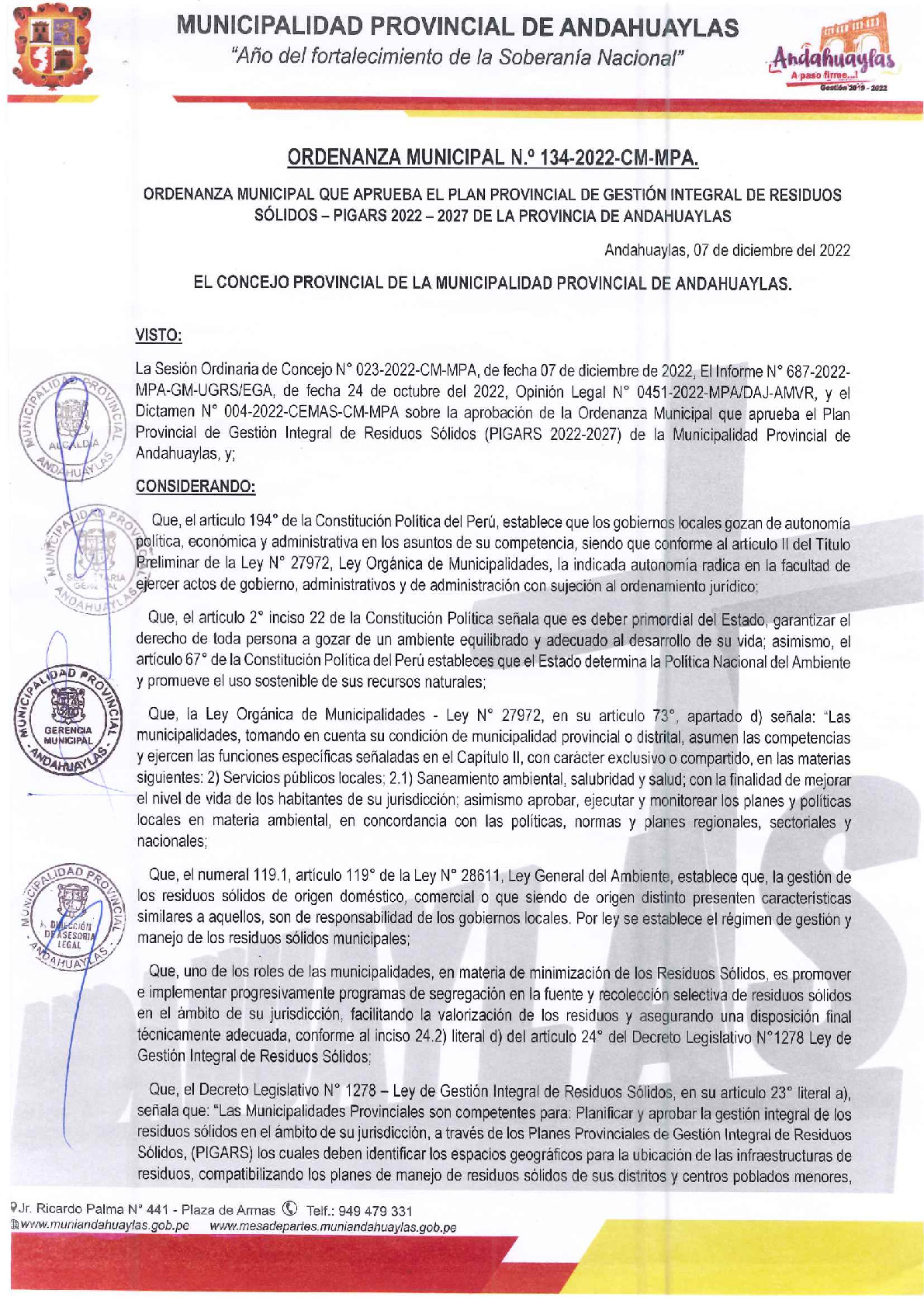 Ordenanza Municipal que Aprueba el Plan Provincial de Gestión Integral de Residuos Sólidos- PIGARS 2022-2027 de la Provincia de Andahuaylas
