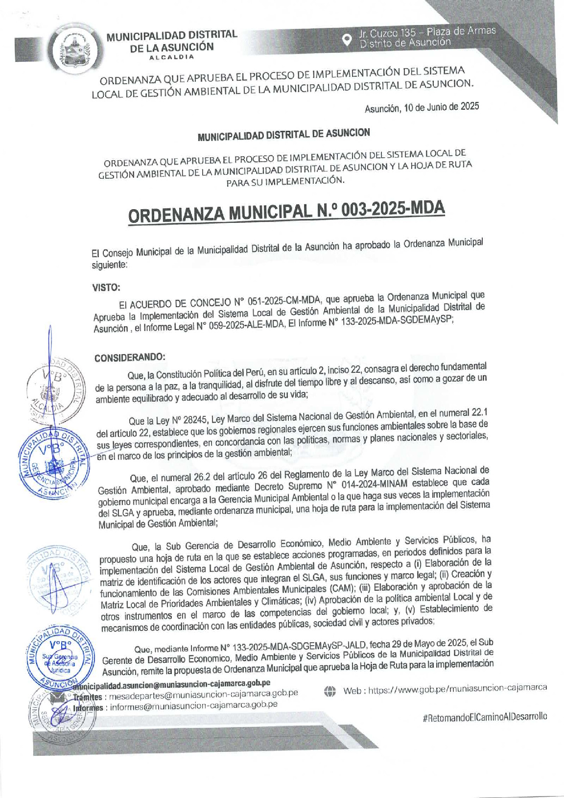 Ordenanza Municipal que Aprueba el Proceso de Implementación del Sistema Local de Gestión Ambiental de la Municipalidad Distrital de la Asunción y la Hoja de Ruta
